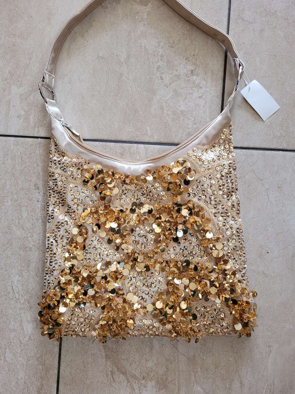 BRAND NEW BRONZE SEQUINED AND BEADED BOHO SHOULDER BAG. ZIPPER CLOSURE. 12"X11". GOLD COLOR ALSO AVAILABLE. TAGS ATTACHED.