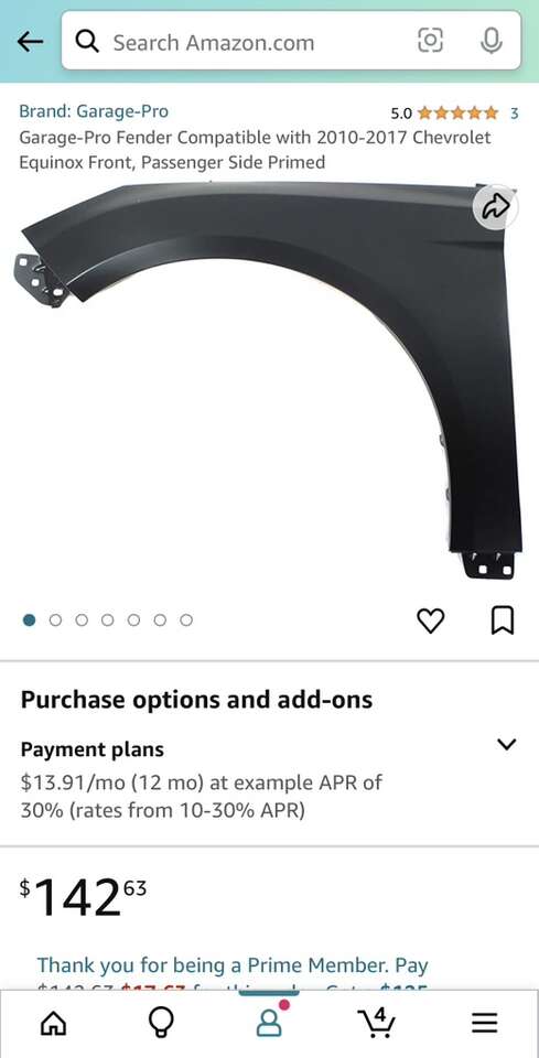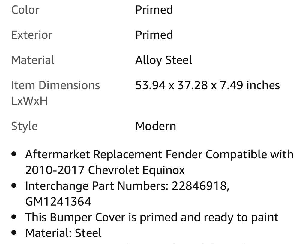 Description- Front left (driver’s side) fender for 2010-2017 Chevy Equinox. Front right side also available. See my other listings. See photos for more product information and specifications.