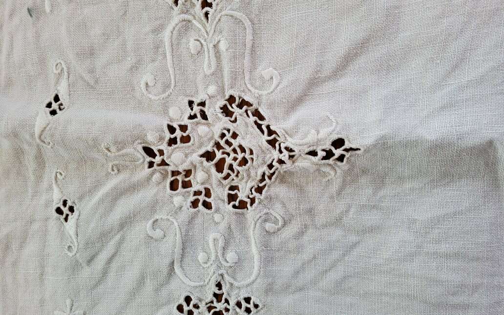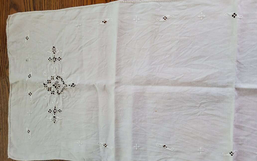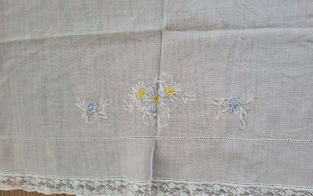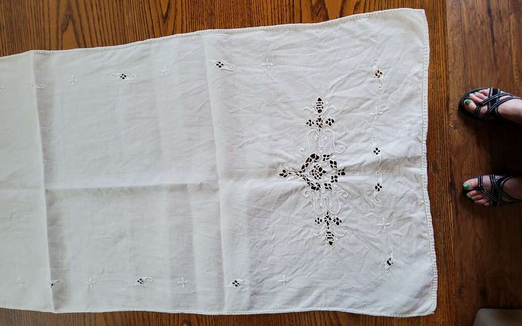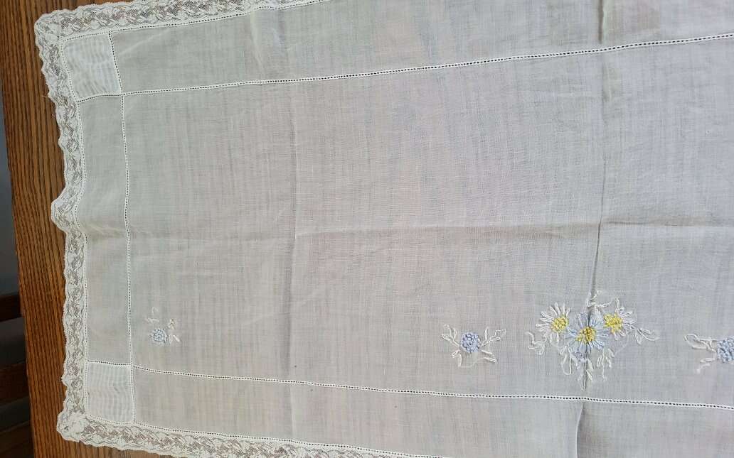 2 Vintage Table Runners. Embroidered, Cut Work. Nice!. Heavy Linen runner is 48 x 17". Nice Art Nouveau Embroideries and Cut Work. One small stain. Sheer cotton runner is 34 x 14.5". Embroidered Daisies and French knots. Some thread pulls. Machine made lace edging. See pictures as part of description CASH OR VENMO ONLY