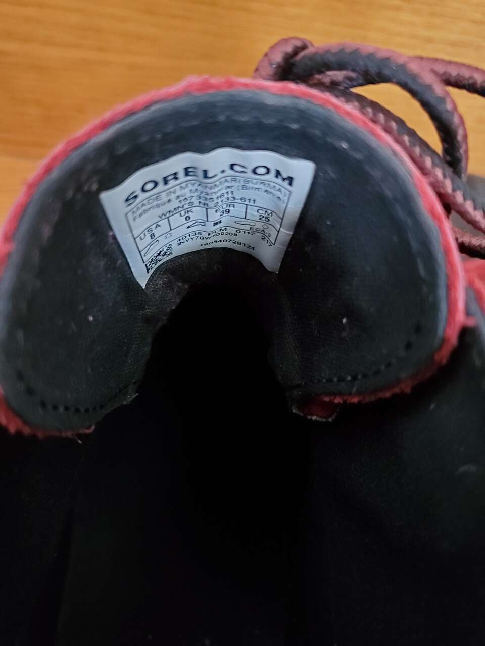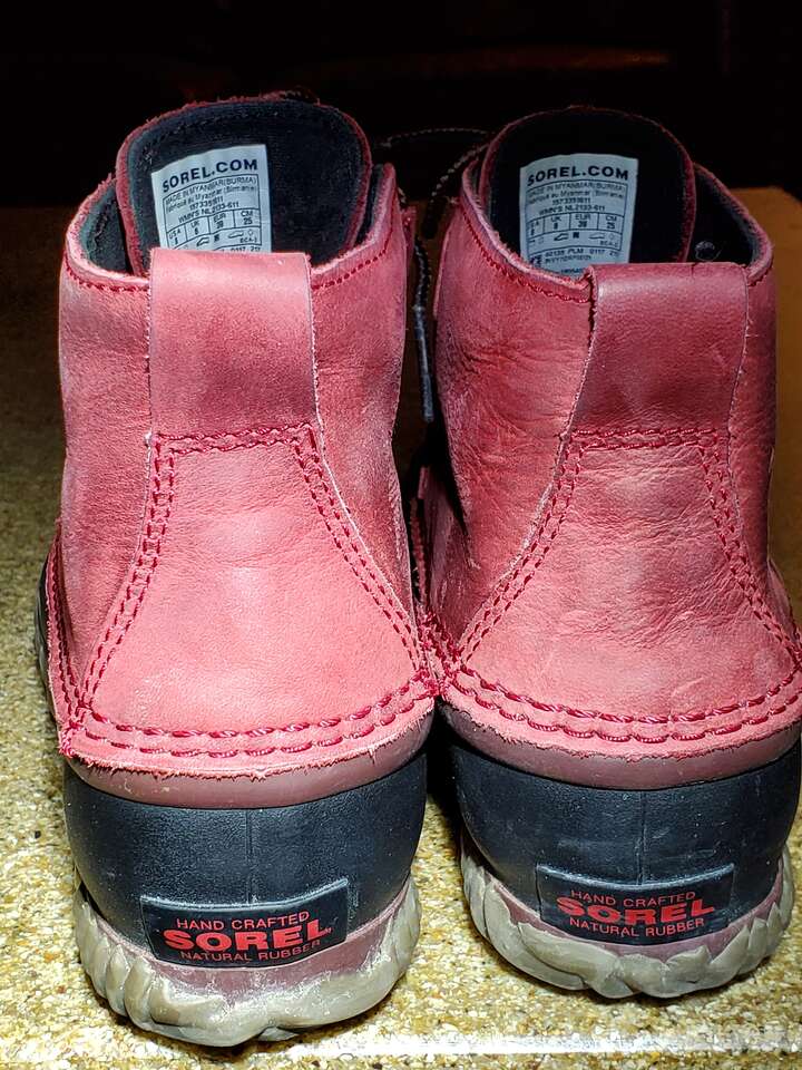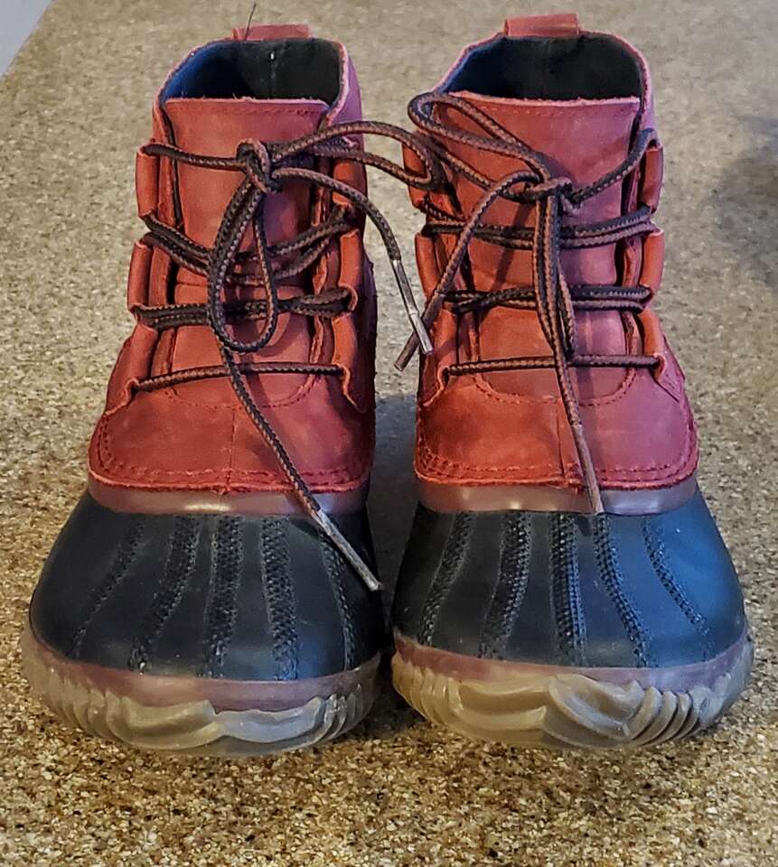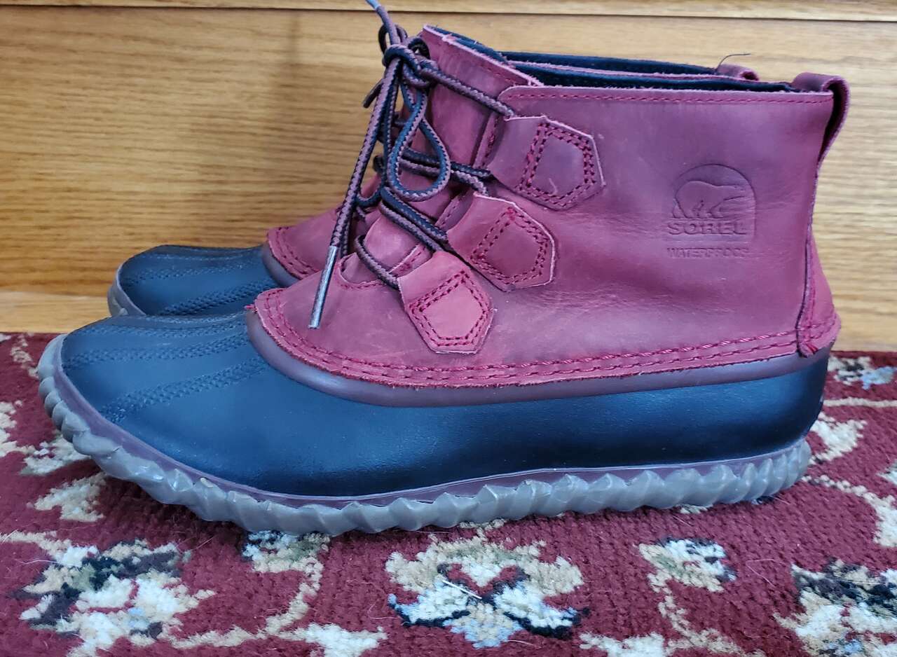 Sorel Red Water Proof Full-Grain Leather Uppers with Seam-Sealed Construction and Cotton Canvas Lining. Out N About Ankle Length Womens Boots Size 8. Removable, Molded EVA Footbeds with Cotton Topsoles. Vulcanized Rubber Midsoles and Outsoles with Herringbone Tread. Cash Only, No Codes.