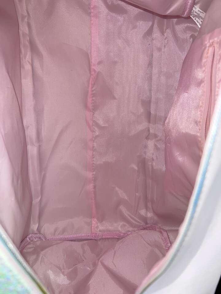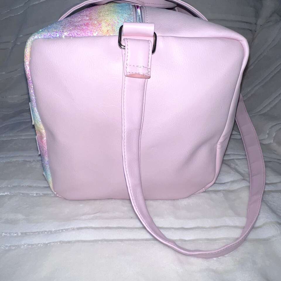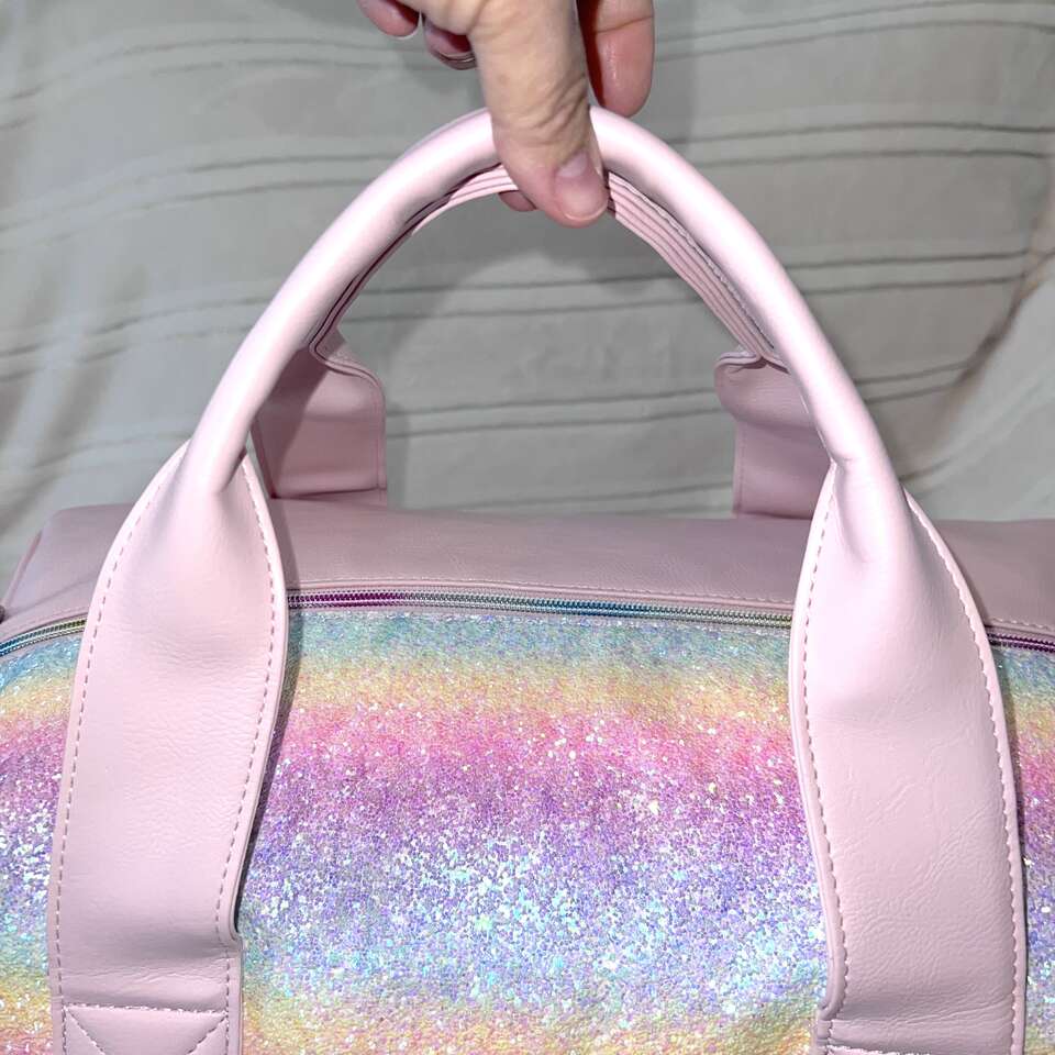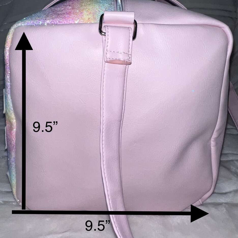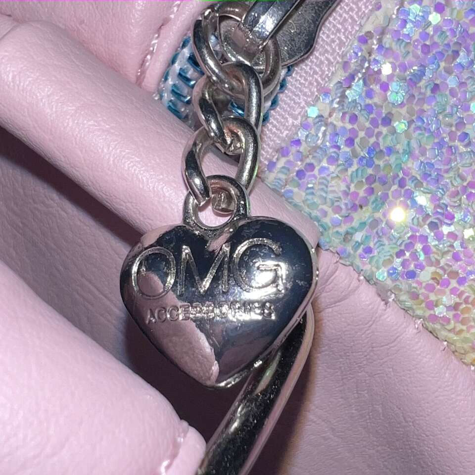 Features glitter front detail, shiny iridescent LOVE lettering, and an OMG Accessories zipper pull. It has an adjustable shoulder strap, spacious main compartment, inside zipper pocket and is perfect as a sport bag, dance bag, carry on for travel, sleepovers, and even school!