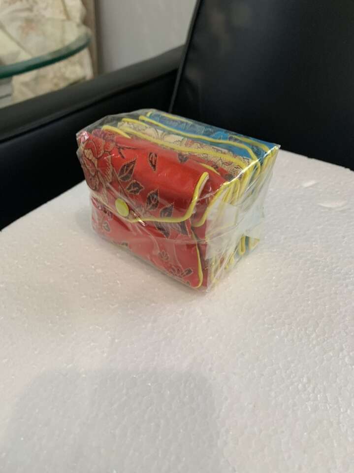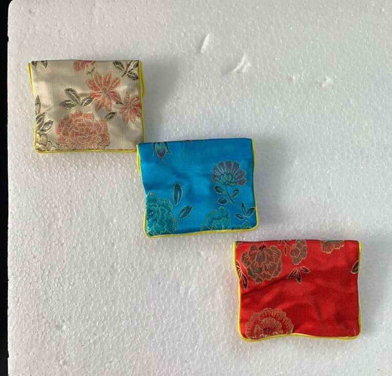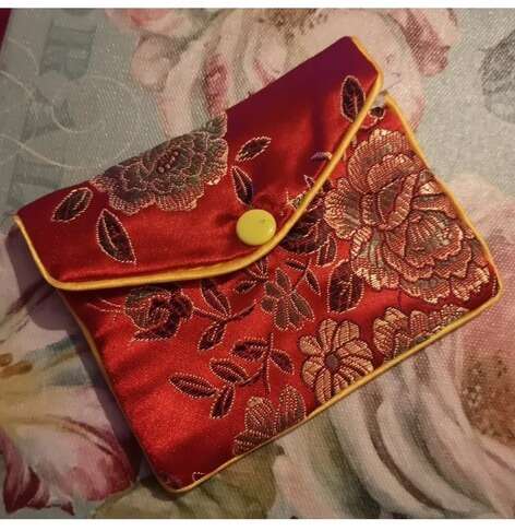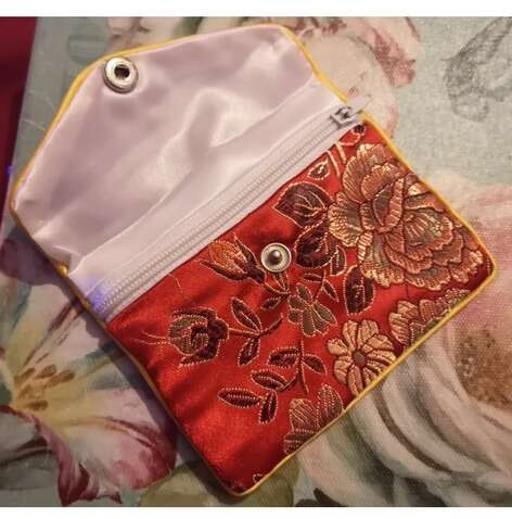 Embroidered floral padded bag. Zips up and has a snap. Brand new. Size 3 1/4 x 2 1/2. All 3 for 10.00. 1-blue/teak and 1-red, 1-beige. All brand new. Coin or jewelry bag