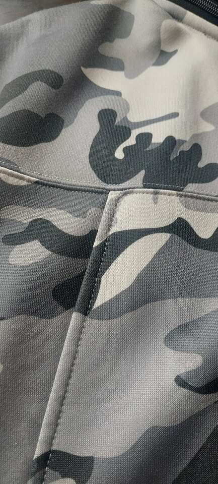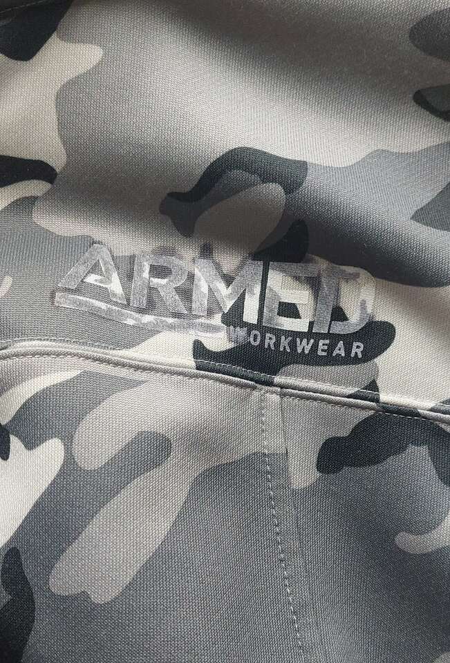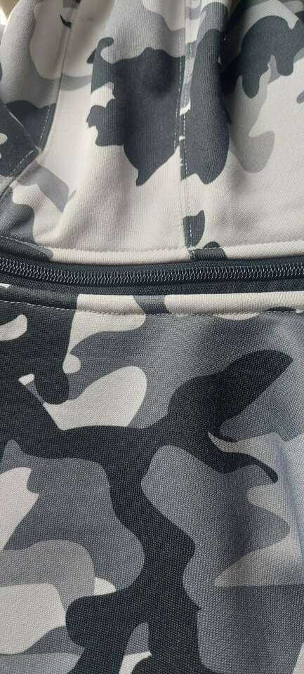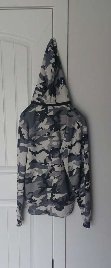 This Armed hood has a full zipper. Removable hood and is in a black/white/grey camo. Size Large.