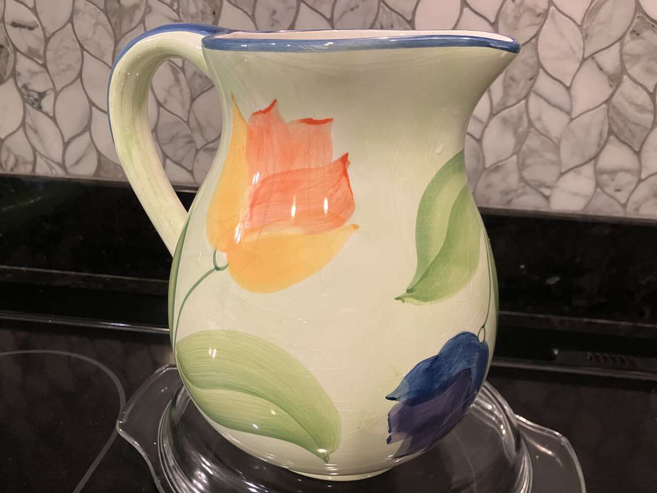 VenmoBEAUTIFUL TULIPS AND LEAVES HANDPAINTED DESIGN ON HIGH GLAZE CERAMIC 2 qt Pitcher. 3 Tulips are in Yellow/Orange, Blue/Navy and Red/Maroon colors. Both photos show both sides of design. Moulded-in handle. Vintage grape-juice intentional interior staining to show off ceramic line designs. $16 Cash/Venmo. In Sandy. 801-201-5350.