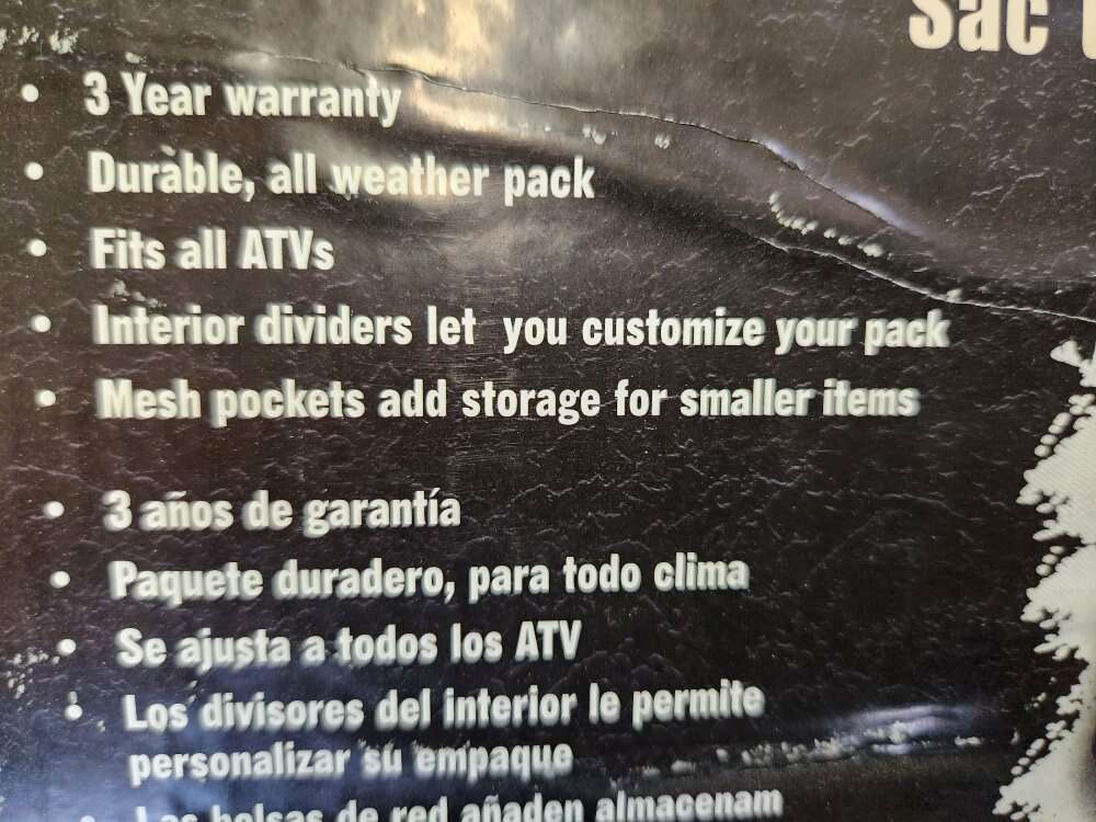 33×16x10 atv pack, use it for everything. New never used. Water-resistant ATV rack storage bags keep cargo dry and safe while enjoying the outdoors on an ATV! For hunting, fishing, or out on the trail, an ATV cargo bag allows extra gear to easily be carried along. The ATV storage bag has a large 2.75 cubic ft. compartment which attaches to a front or rear ATV rack with (4) built-in tie-down straps. A full-length zipper and weather flap secure the cargo storage area and reduce moisture from entering. Larger cargo can be organized into three sections with hook and loop fabric dividers. Smaller items may be secured in one of (3) mesh storage pockets.