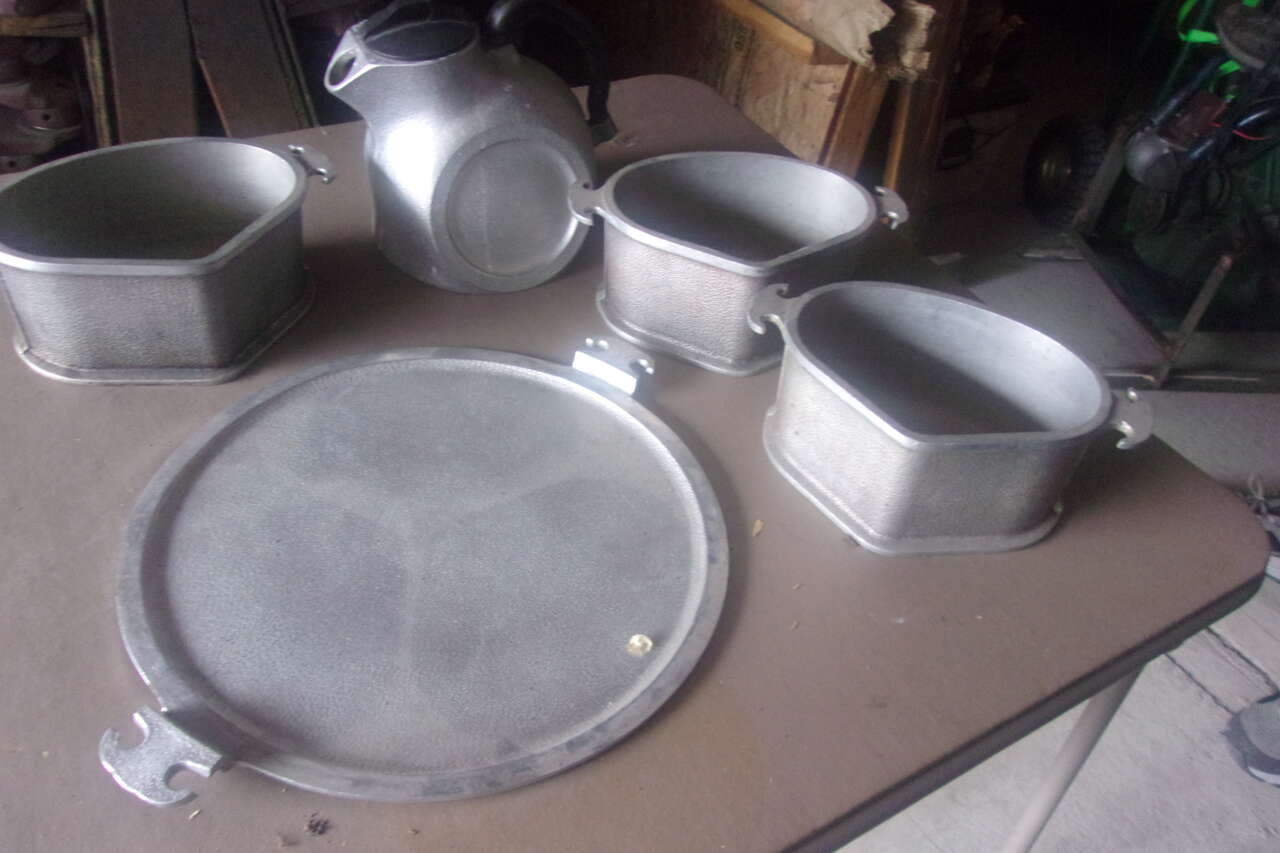 HEAVY DUTY SERVING/ cooking set Includes large seving tray. plus 3 pans heart shape fit together on tray.) also large Pitcher & a large spoon included, that fit on the tray forming a perfect set. EXCELLENT CONDITION W/NO DAMAGES WHATSOEVER, (no lids) perfict matched set. from 1940's - '50's Asking $45 , for the set, call or text Karen 435-512-1799 in Logan