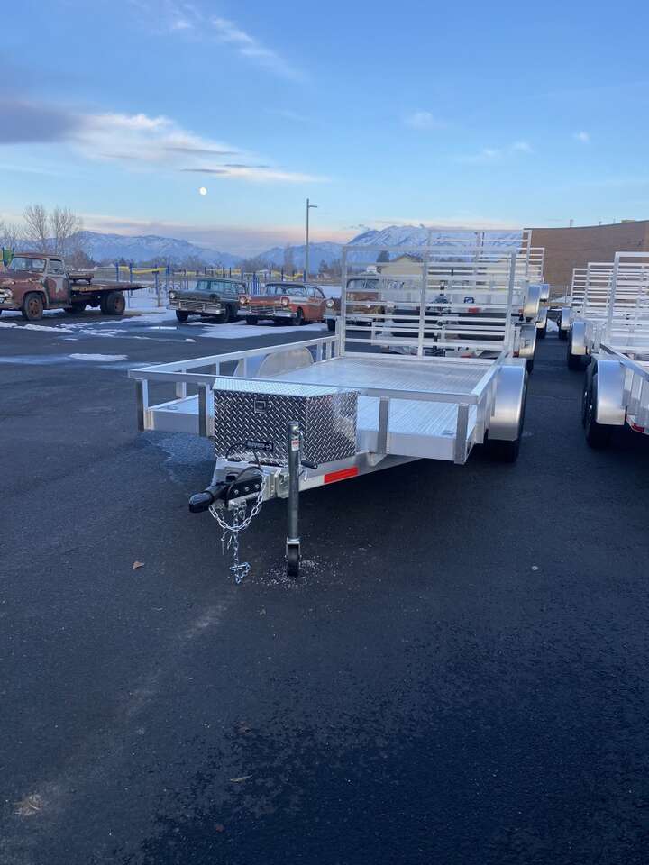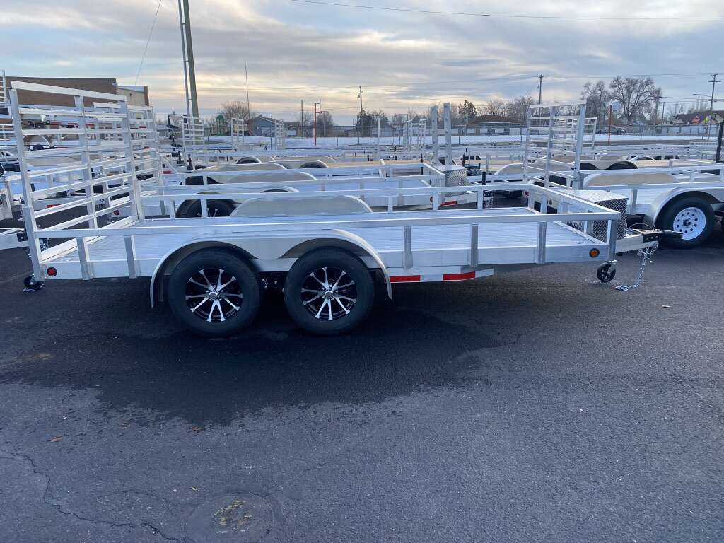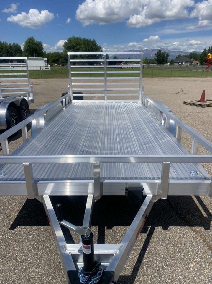 !!All aluminum frame and deck quality built tandem axle trailer. Lite weight easy to use fold down ramp for easy load and unload. Tandem axle with electric brake great for those new larger machines or any sxs call or text Dee 801-668-6266 other lengths of trailers available as well. Premium package includes alloy wheels tongue box and spare add 950