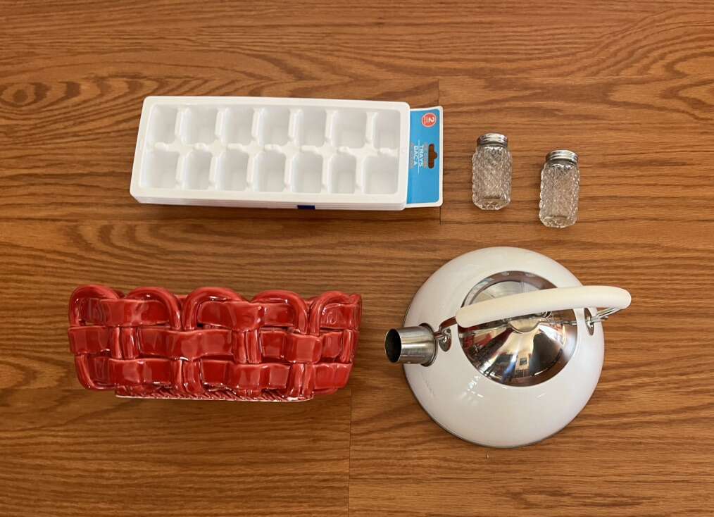 Set includes White 1,5 Qt tea pot (works on any surface), 4 white plastic ice trays, red (wicker) ceramic bread basket/ fruit bowl and Salt and Pepper set. All in good condition, no chips or damages. $10 Must take all.
