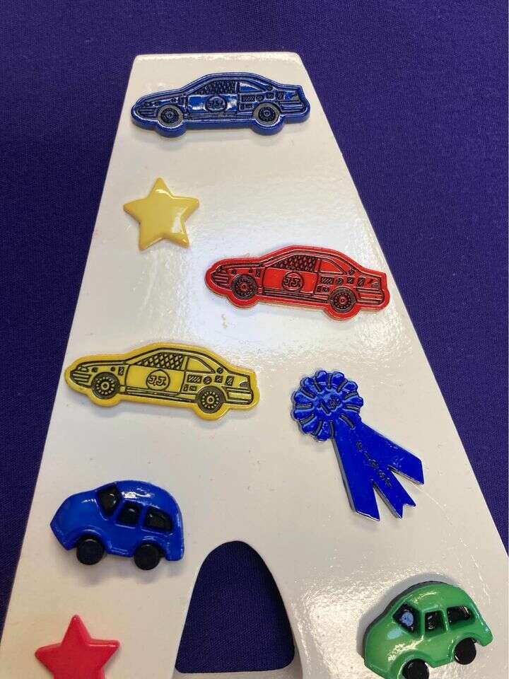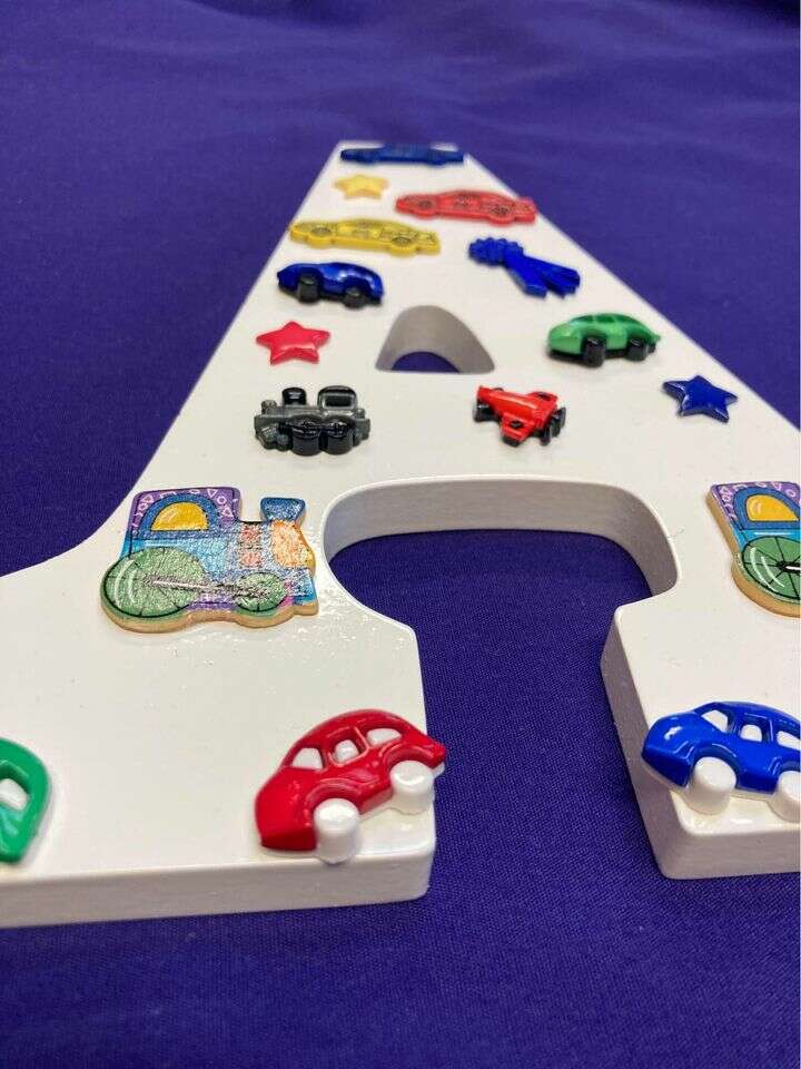 ApplePayHand painted and decorated wooden letter A in transportation theme. Embellished with cars, trains, planes and race cars. Great gift for baby boy or young child. Perfect for the nursery! Dimensions are: 9“ x 6.5“ x 1“. Pre-drilled hole on the back for easy hanging. Made in smoke free home. Shipping is availble.