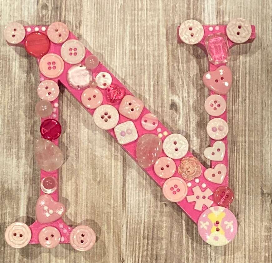ApplePayHand painted and decorated small wooden letter N embellished with pink buttons and trinkets. Perfect for baby girl nursery and little girl bedroom decor. Dimensions are: 6 wide x 5 tall x 1 deep. Pre-drilled holes on back for easy hanging. Made in smoke free home. Shiping is available.