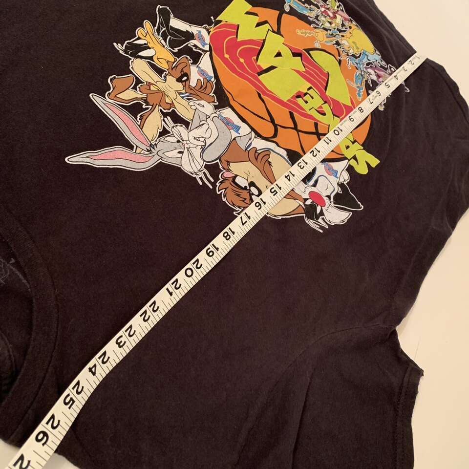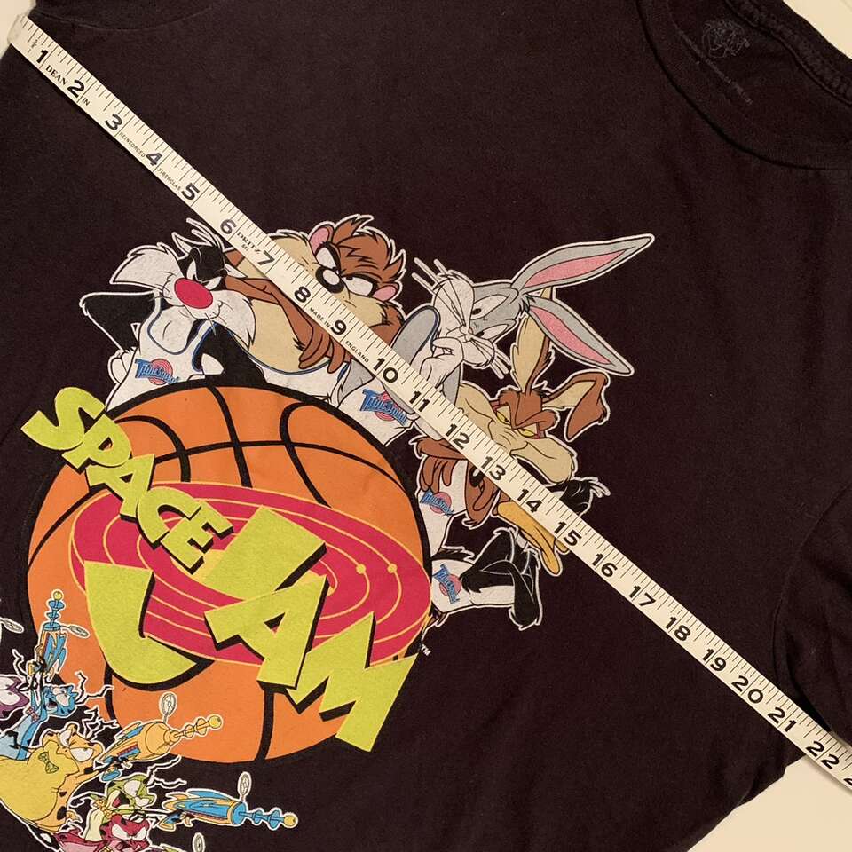 Black cotton Space Jam tee size large measures 21.5 inches across chest 26.5 inches shoulder to hem. Message me if interested in purchasing.