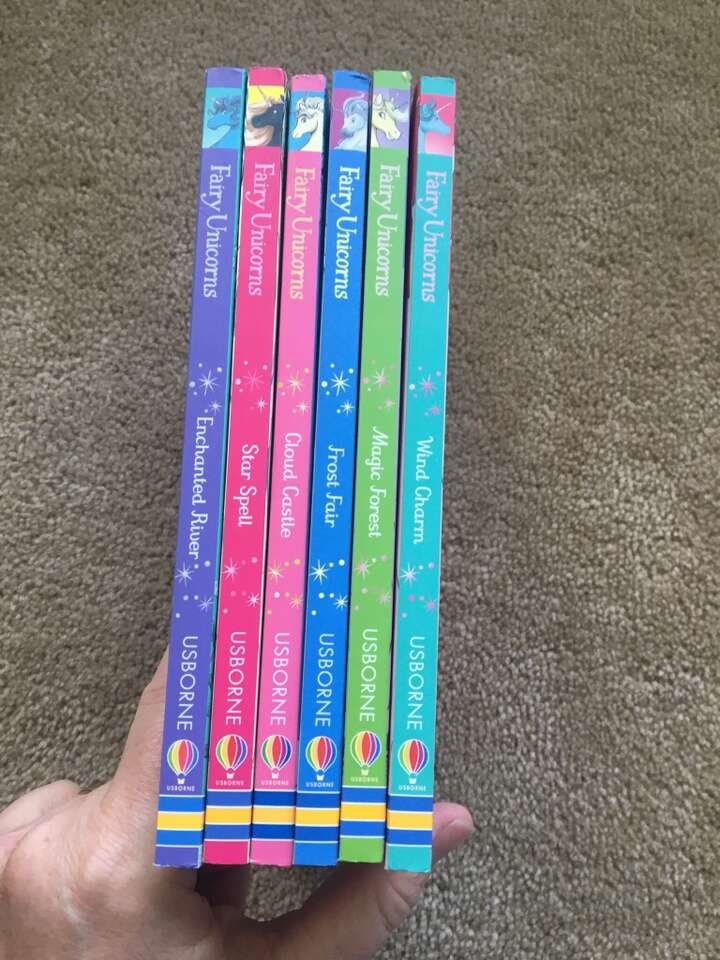 6 Usborne Fairy Unicorn Books, by Zanna Davidson: Enchanted River, Star Spell, Cloud Castle, Frost Fair, Magic Forest, and Wind Charm. Illustrated by Nuno Alexandre Viera. Sturdy paperbacks in excellent condition, with easy-to-read text and darling illustrations. Text only. Cash or Venmo.