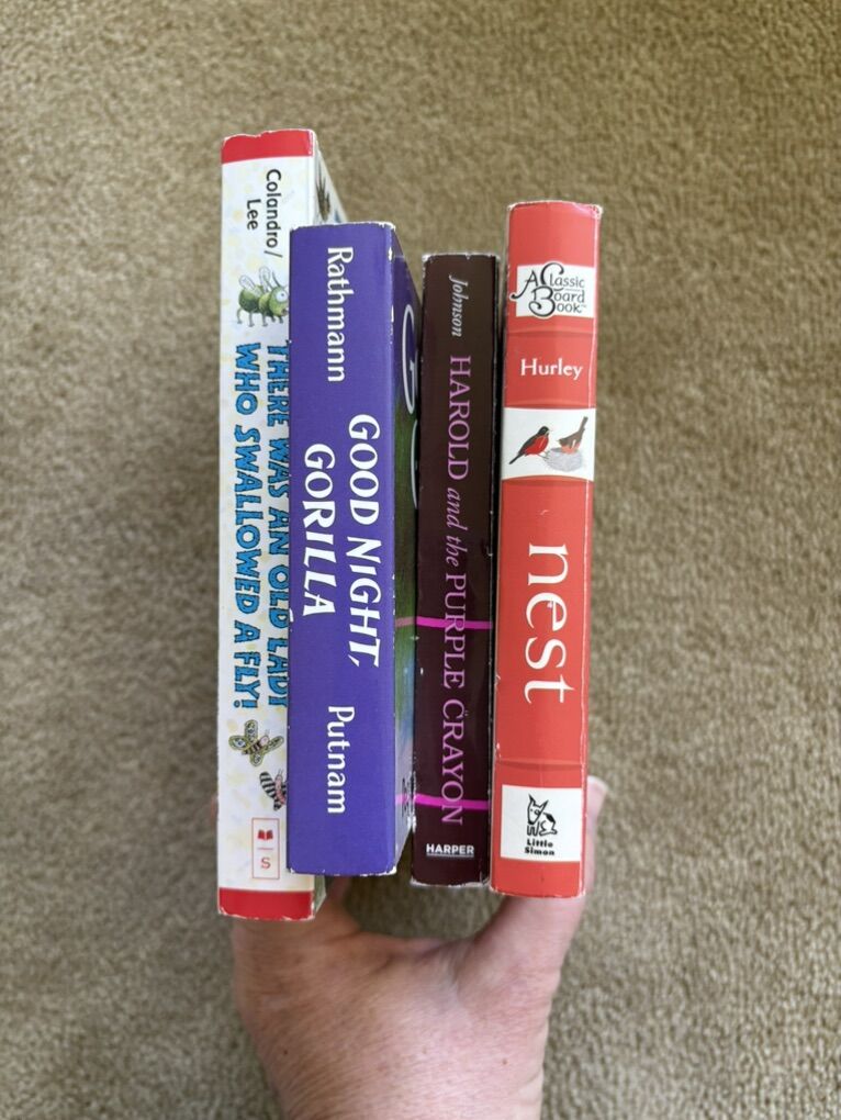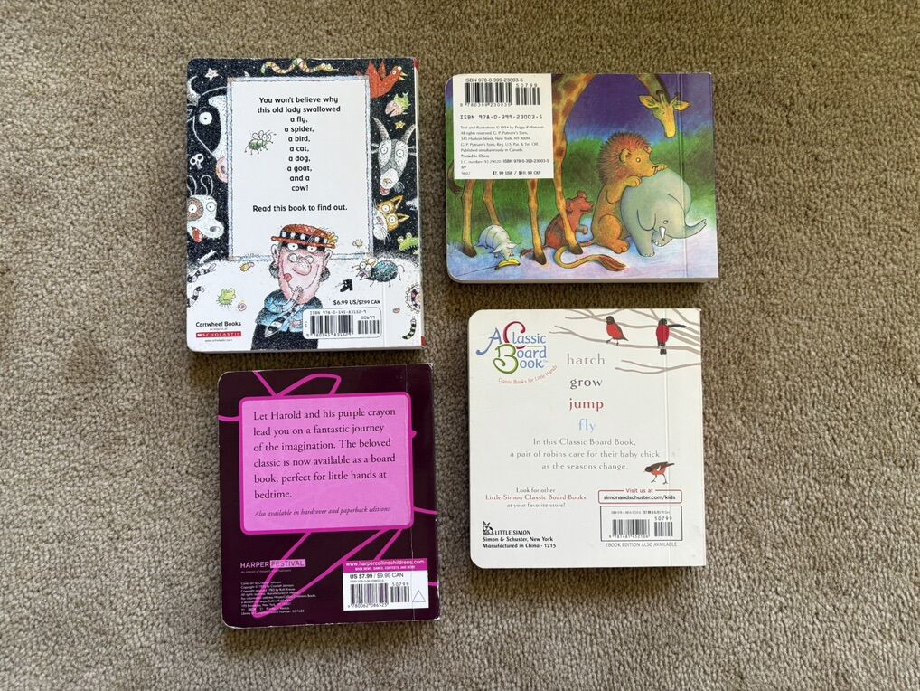 Four Classic Board Books, Set 2: There Was an Old Lady Whol Swallowed a Fly!, Good Night Gorilla, Harold and the Purple Crayon, and Nest. All in very good condition. Text only. Cash or Venmo.