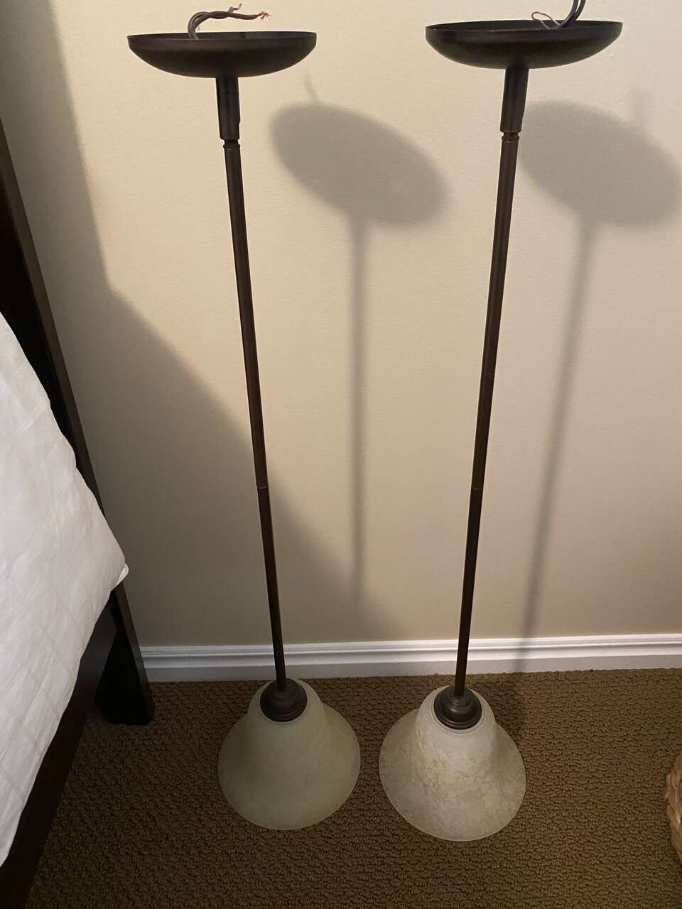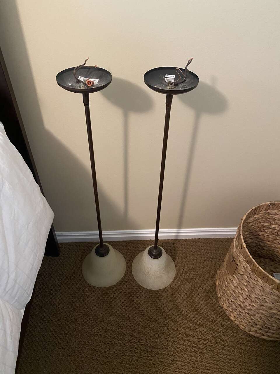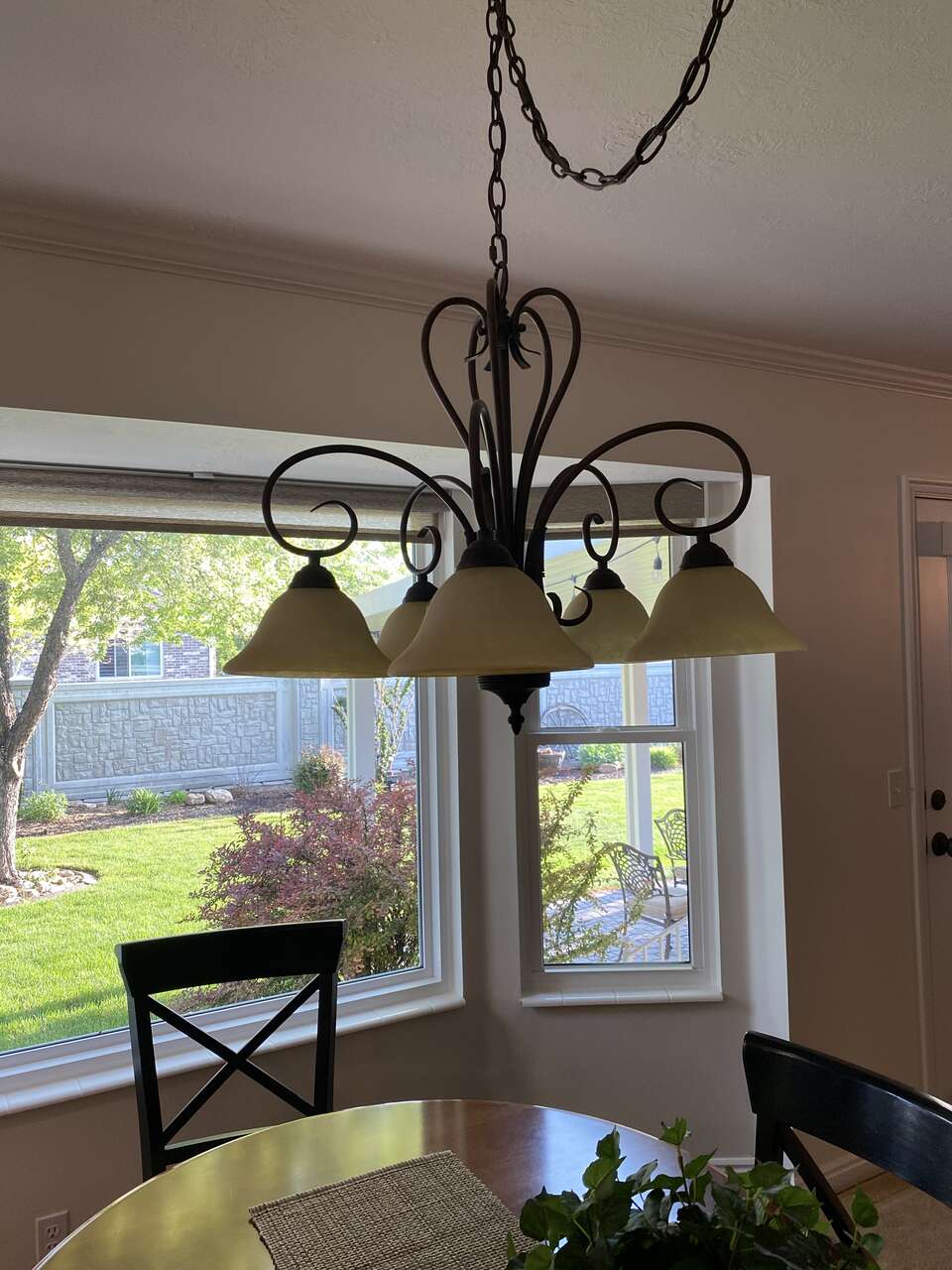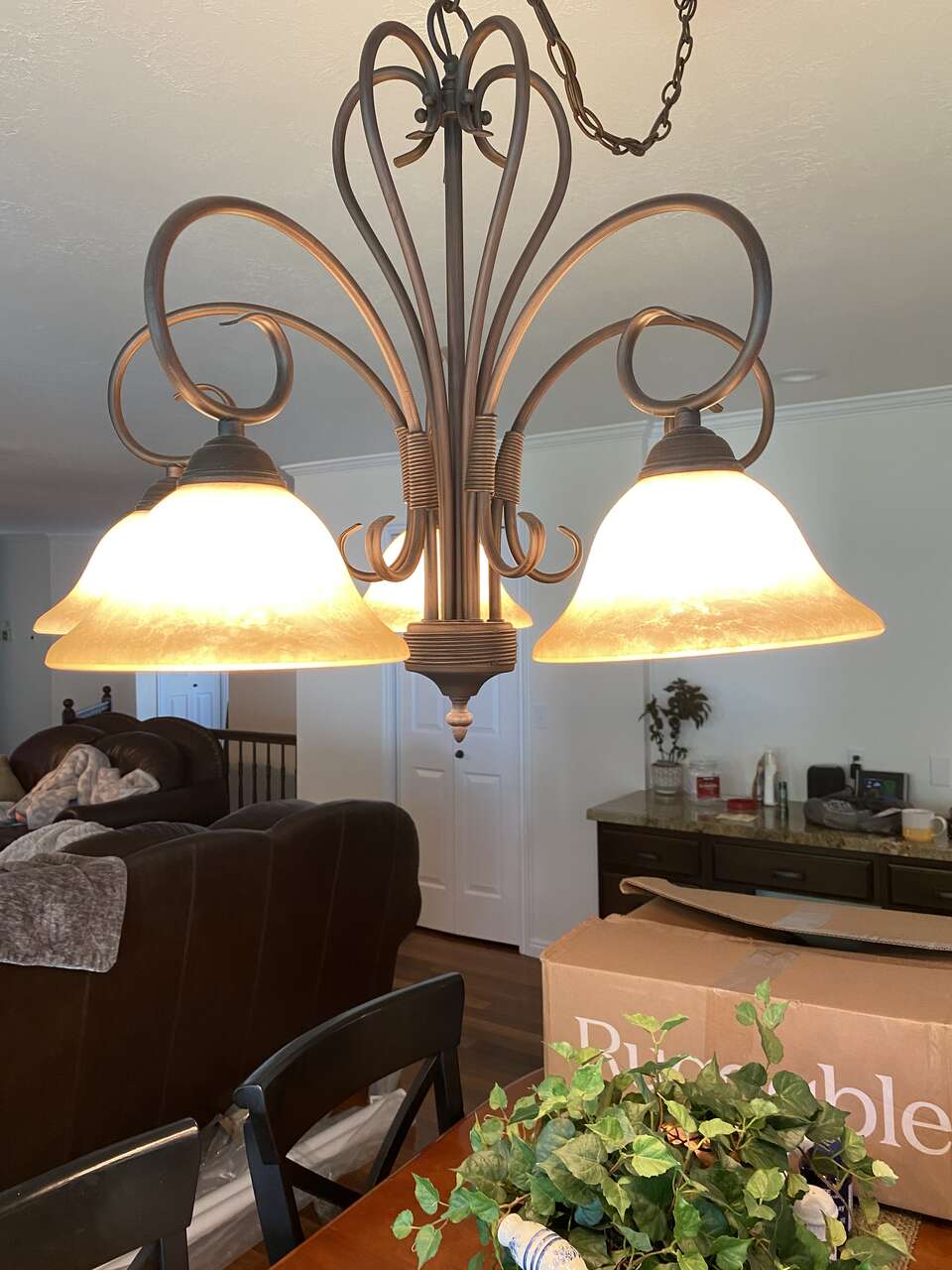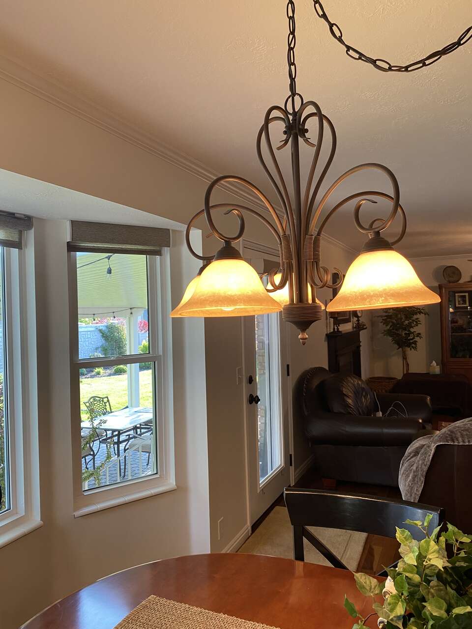 Golden Lighting Company Oil Rubbed Bronze over the table light and matching over-the-counter pendants. Homestead collection. Excellent condition. These were purchased at a design lighting store. All work like new. High-quality lights. The first photo is a stock photo; the rest are the actual lights. The chandelier alone is currently selling on Amazon for $175. https://www.amazon.com/Golden-Lighting-8606-D5-RBZ-Chandelier.