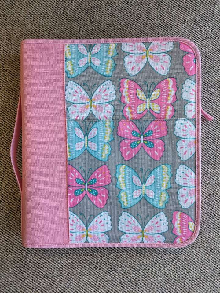 LIKE NEW CONDITION! Makenzie Butterfly design. 3-ring binder, pockets, zips closed. Message or text 801-864-6053. Cash only please. Firm on price. I can meet at the Kaysville Library (Tuesdays or Fridays) or the South Weber Maverick. Please see my other ads. Thanks!