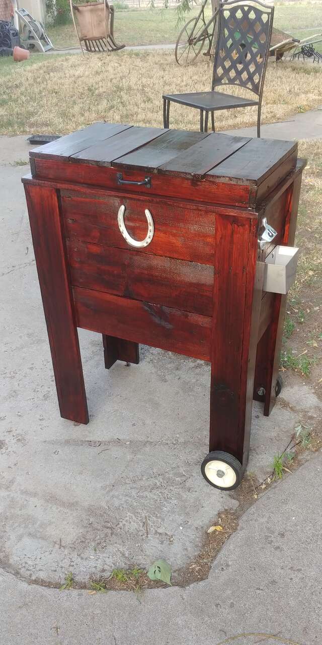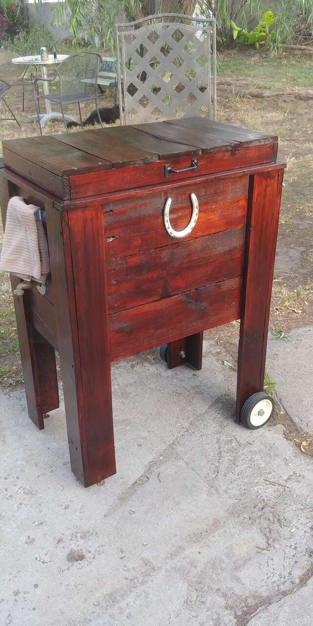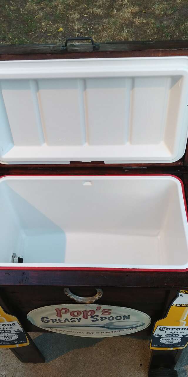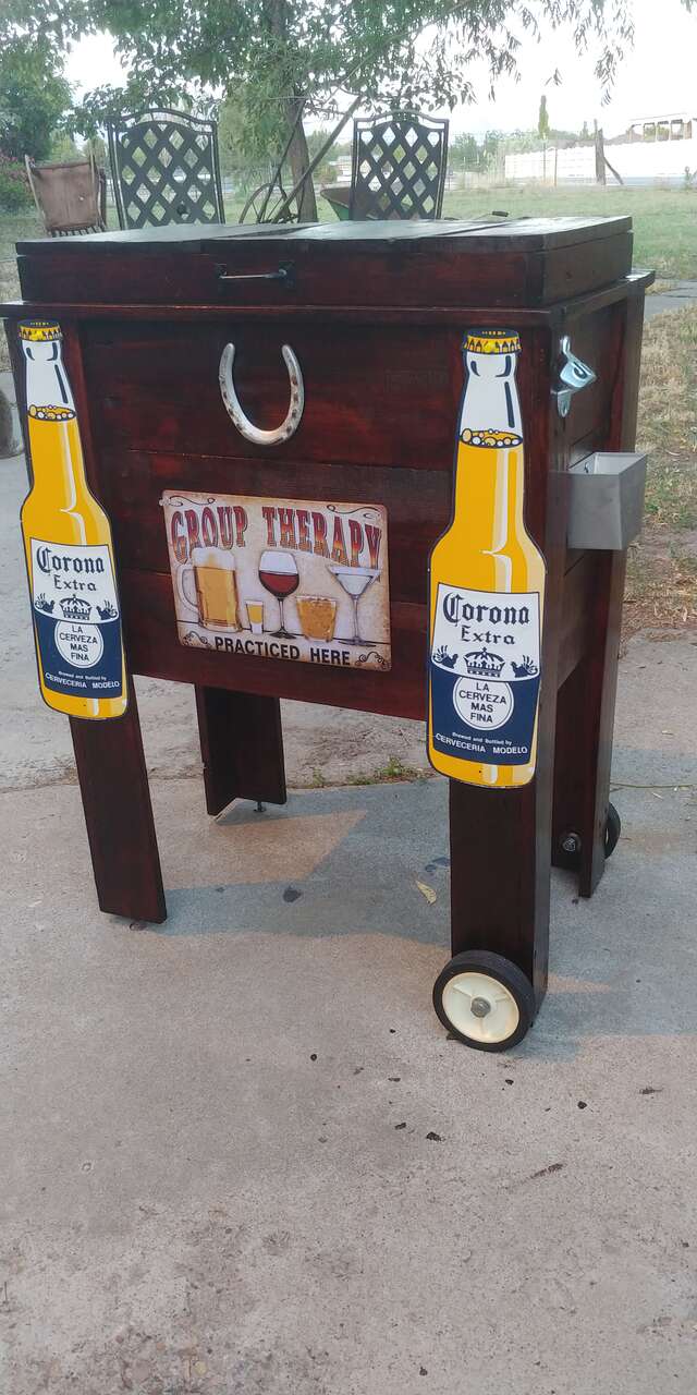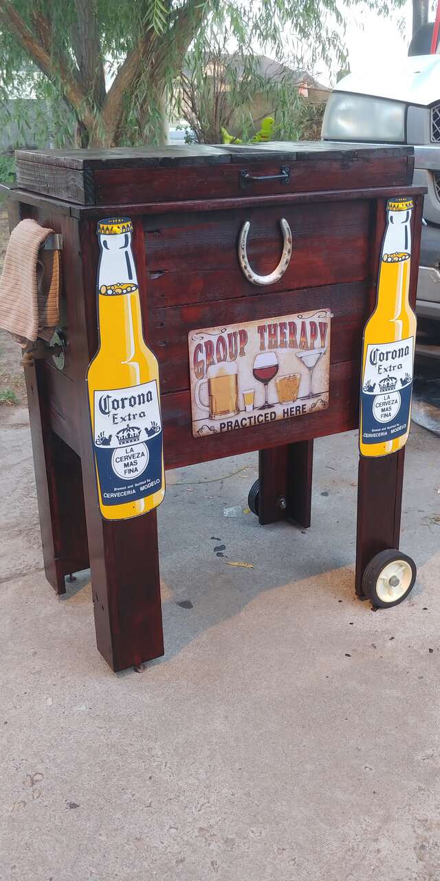 VenmoNice cooler, table. Indoor/outdoor. Your choice of metal signs. Size, 30 wide 19 deep 37 high. Has wheels, bottle opener, towel rack, and drain. Two fresh coats of Bombay Mahogany Polyurethane finish. Great for any barbeque. Call or text. Check out my other adds.