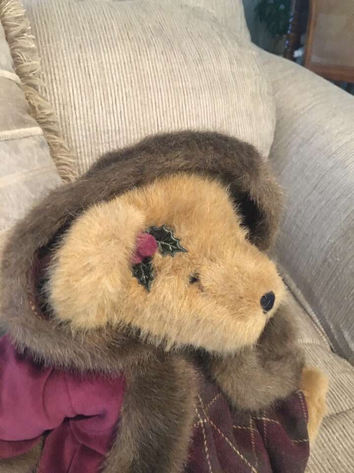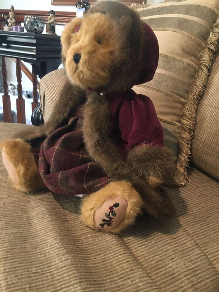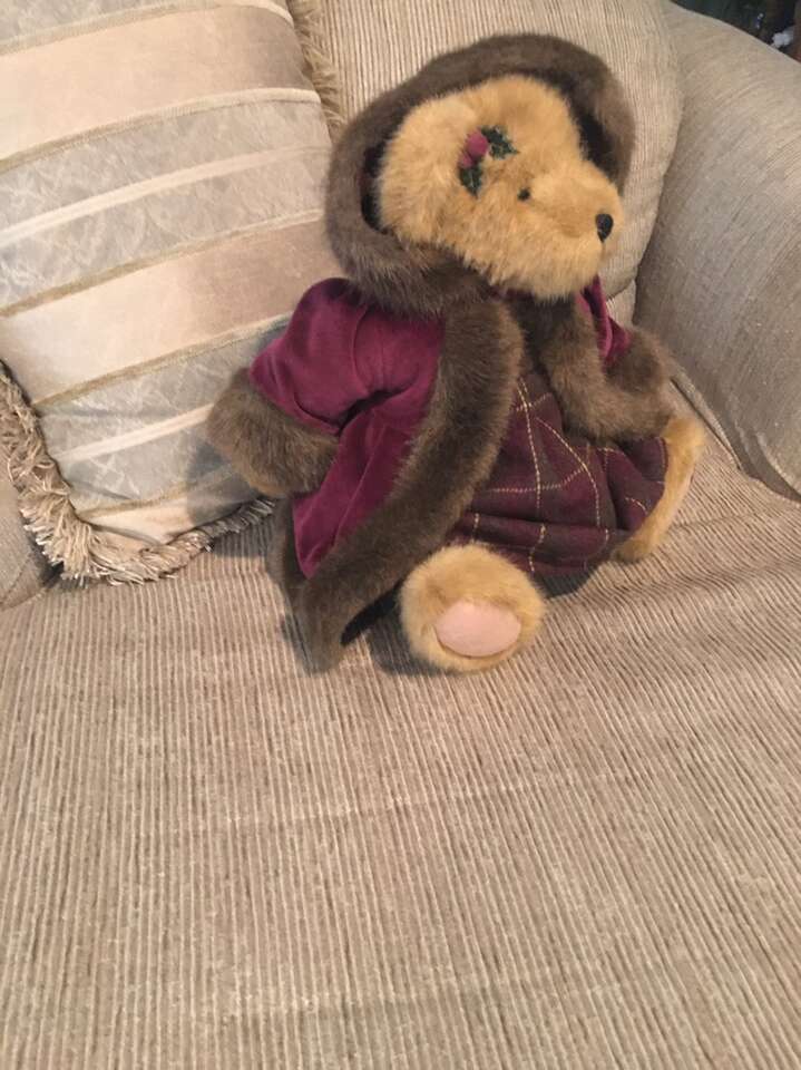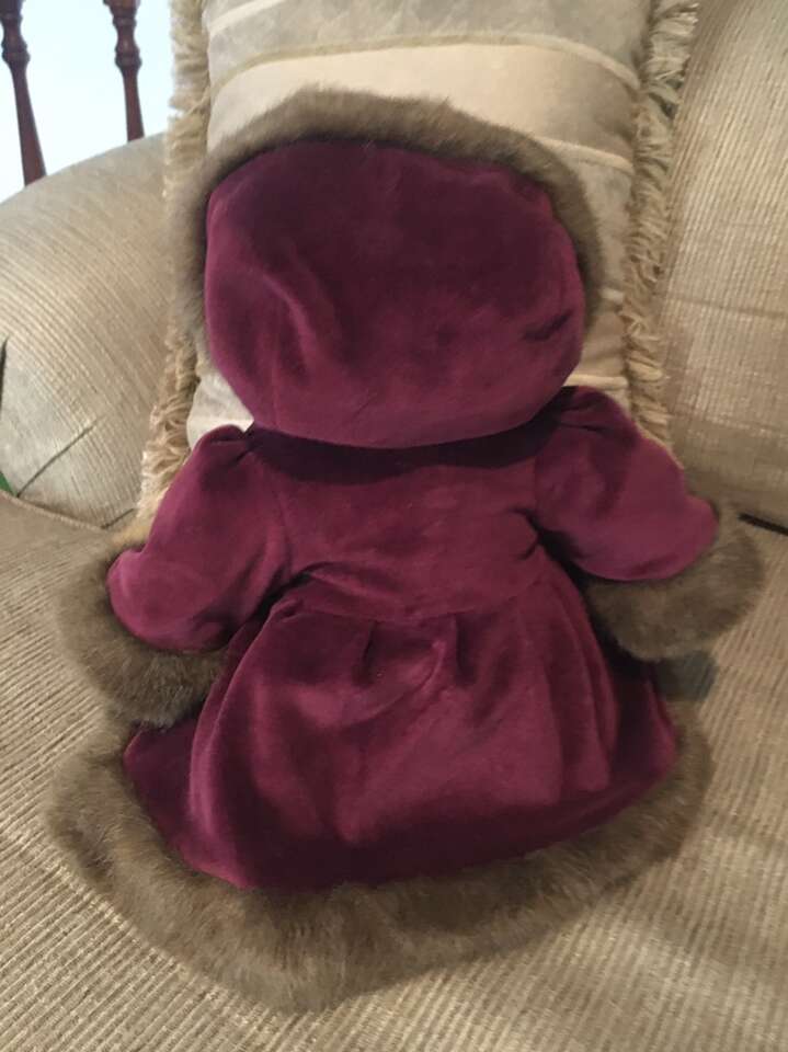 Plush 16” Bear…Vivian Q. Dickens. Wine Colored Coat and Hood with Fur Accents and Plaid Dress. Movable Arms and Legs.