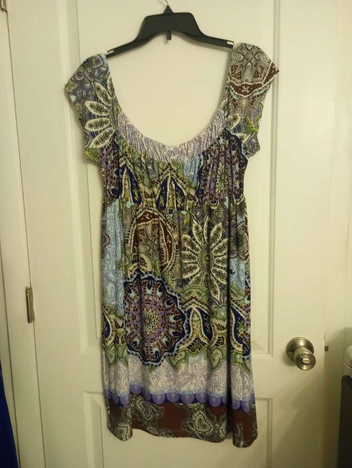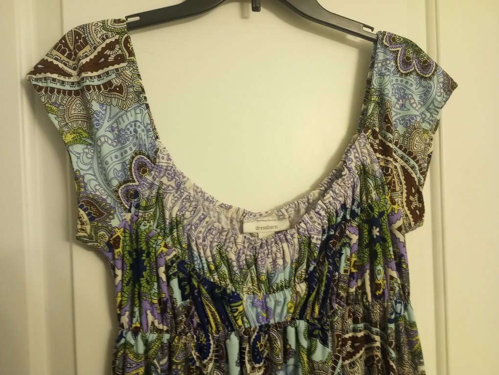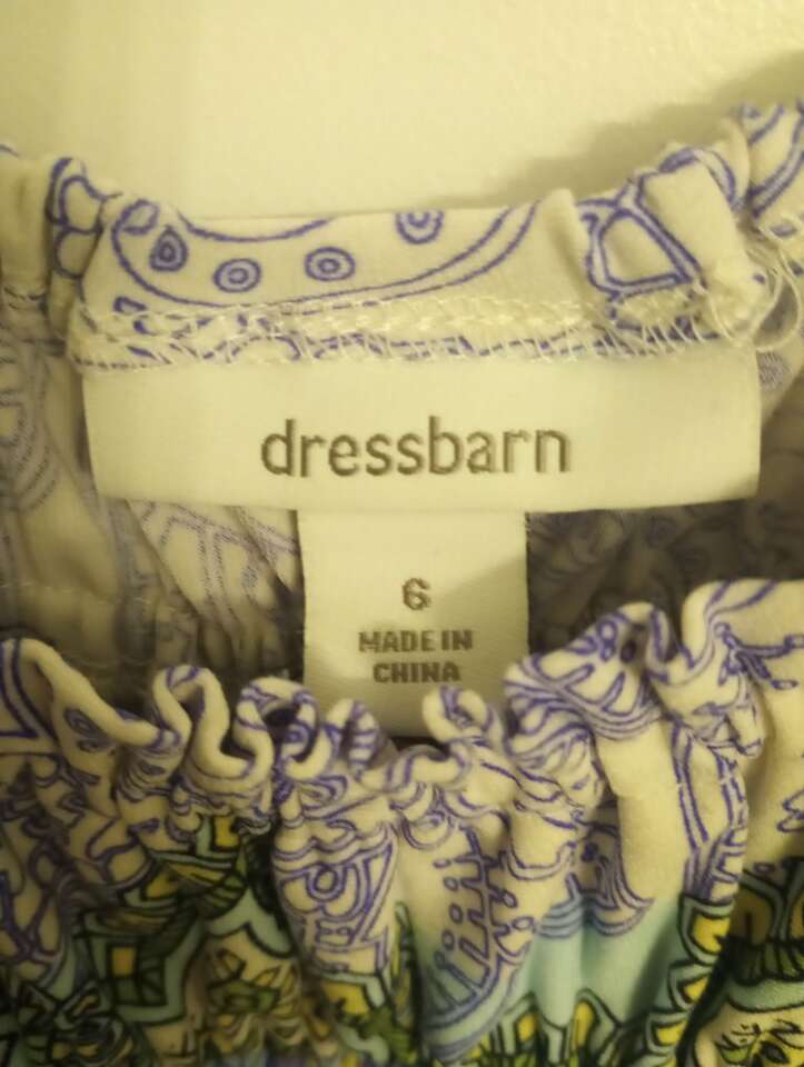 Gently used, women's dress~ multicolored, patterned. Size 6, from Dress Barn. In excellent condition, and from a pet and smoke-free home. 95% polyester, 5% spandex. $10 cash or Venmo. Will hold with Venmo. Lots more women's clothing for sale.