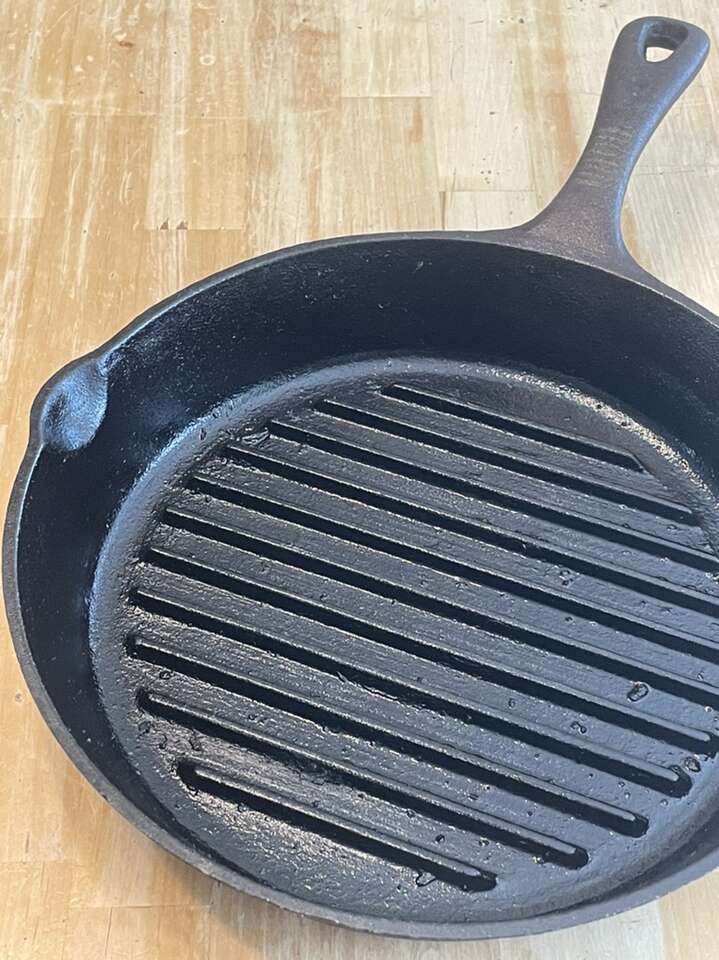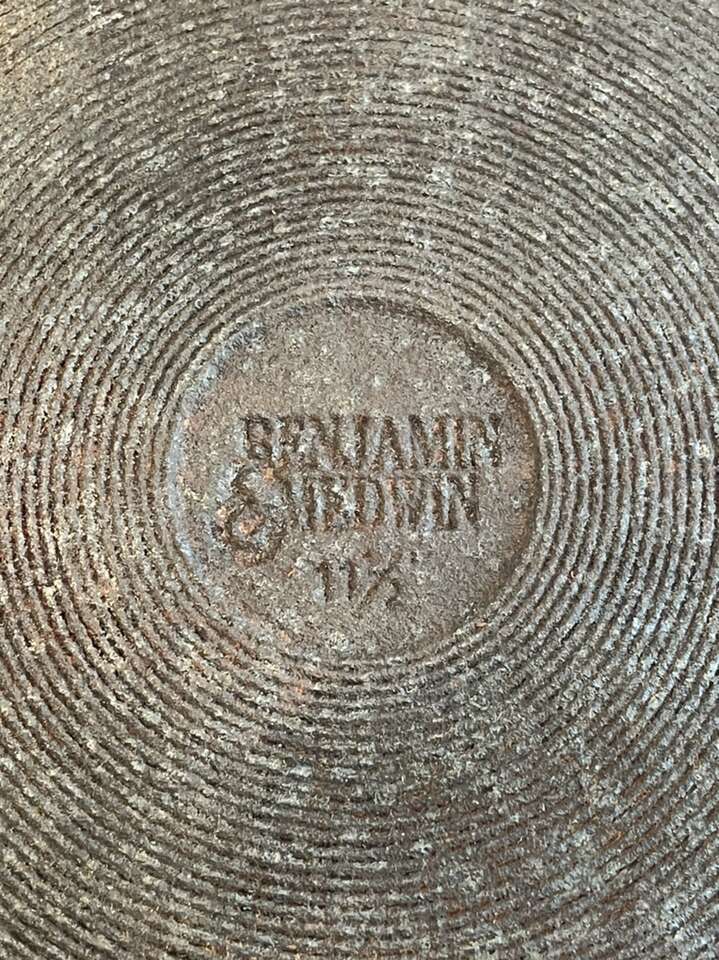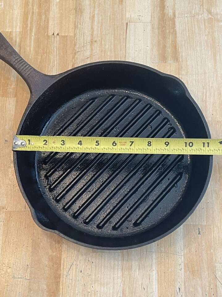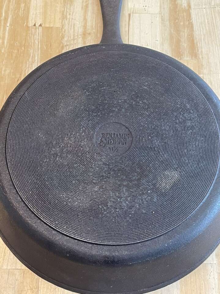 Benjamin & Medwin 11 1/2” cast iron skillet, round, dual spout, ribbed surface.
