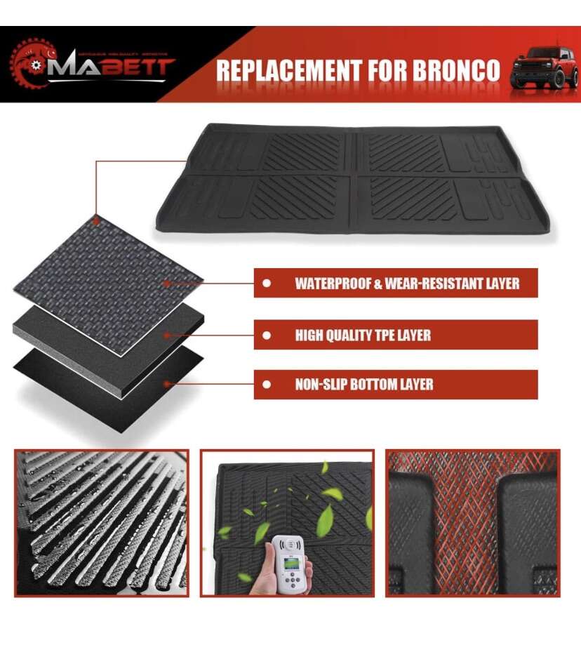 Mabett Cargo Liner Provides complete trunk and cargo area protection. Our Cargo Liners are digitally designed to fit your 2021 2022 Ford Bronco (Doesn’t fit 4-doors or Bronco Sport) Mabett Cargo Liner features a raised lip to keep spills, dirt and grease off your vehicle’s interior, protecting your investment from normal wear and tear. Mabett Cargo Liner is made from TPE that is not only wear resistant, but also remains flexible under temperature extremes. Mabett Cargo Liner features a textured finish that helps to keep cargo from shifting. Perfect for hauling just about anything from gardening supplies to construction materials, even the family pet. Mabett Cargo Liner are easy to clean. Whether it’s dust, dirt or sand on the mats, it only take a few minutes to wash it off with water or a damp towel.