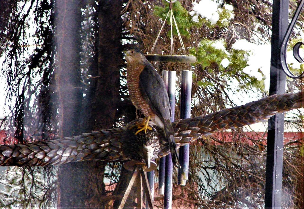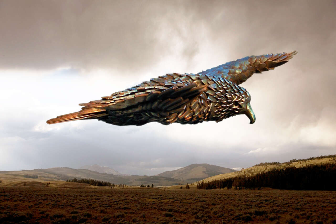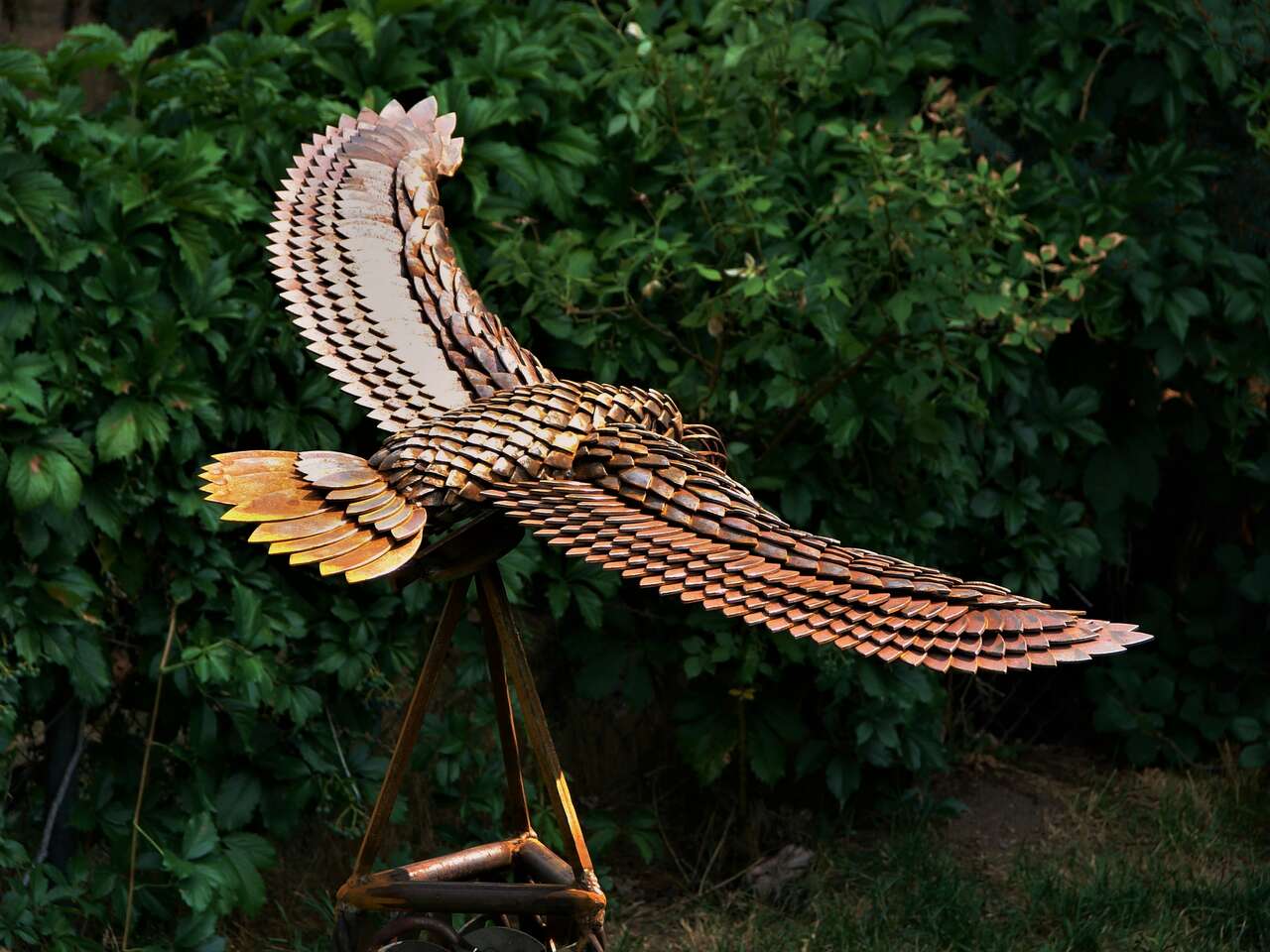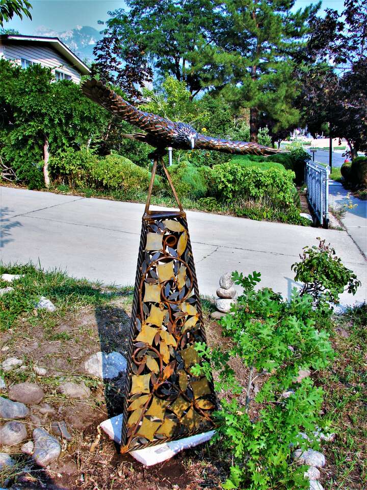 Created with scrap "feathers", this Red-tailed Hawk took 7 months to create, piece by piece. The 1/8th inch thick steel feathers will rust for a very long time. The sculpture is 64" tall, by 45" wide at the wings. The Hawk weighs 58.6 lbs by itself. Over 400 hours were invested in this sculpture. This sculpture took first place in 3 metal divisions and "Best of Show" at the Utah State Fair.