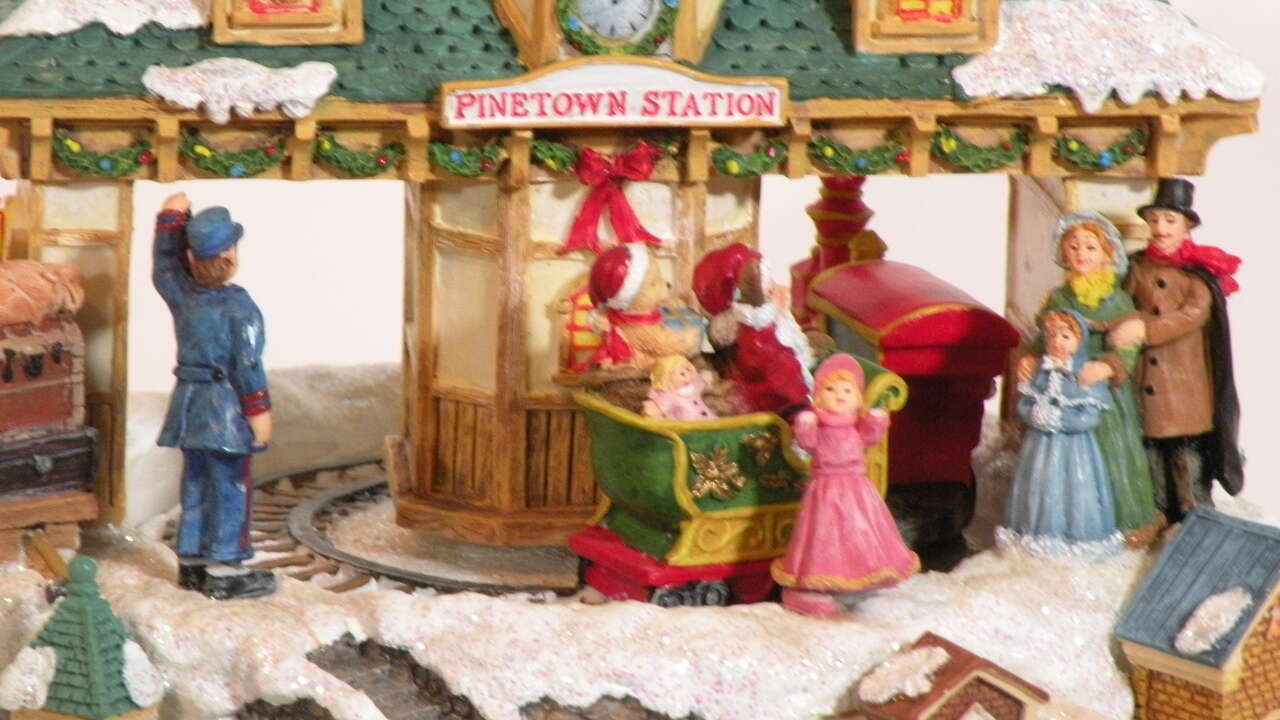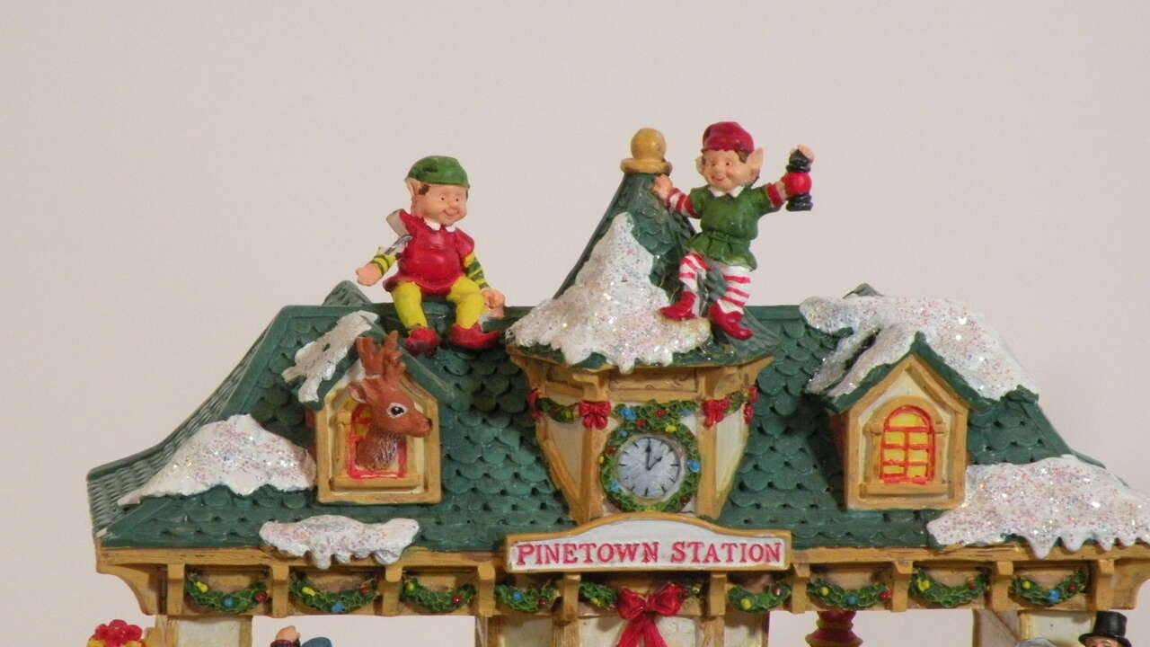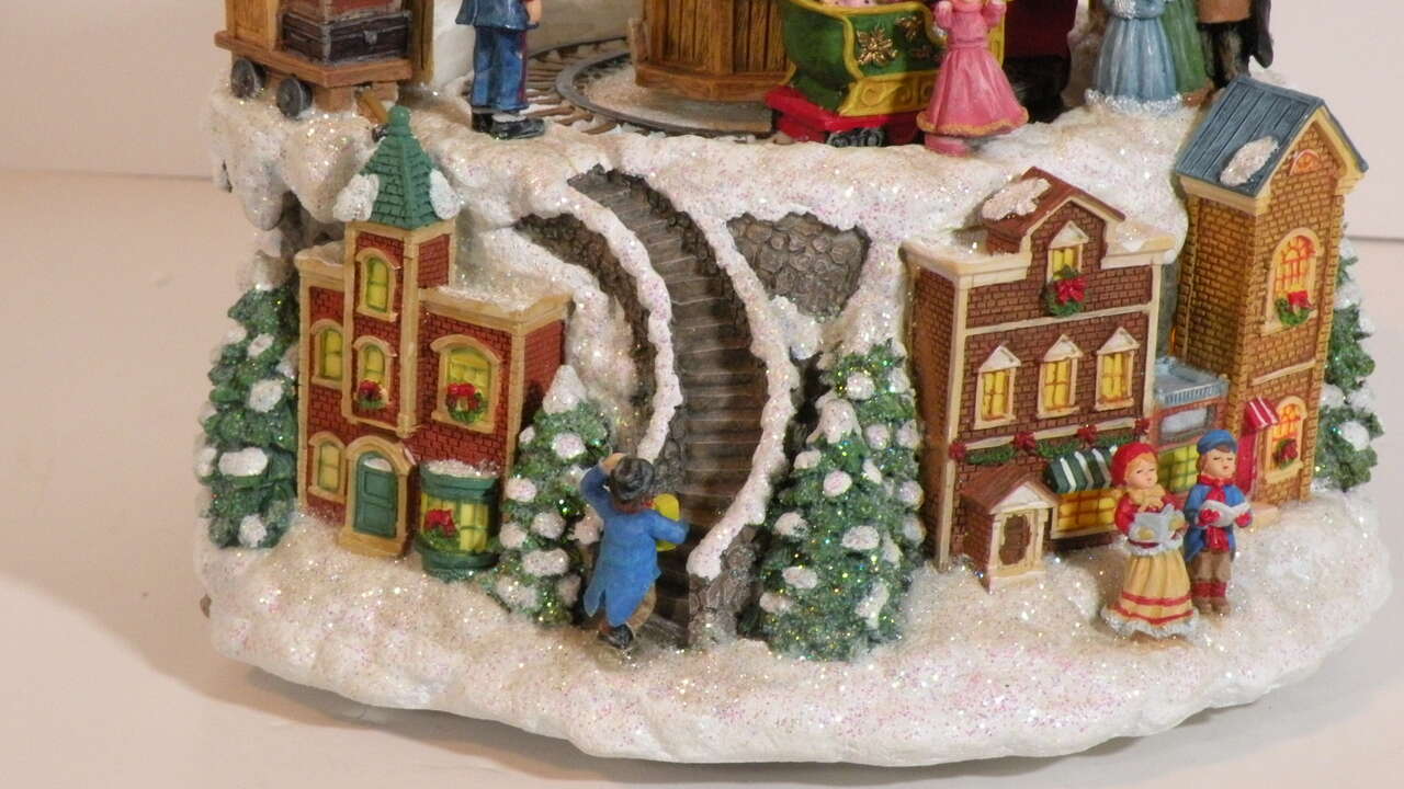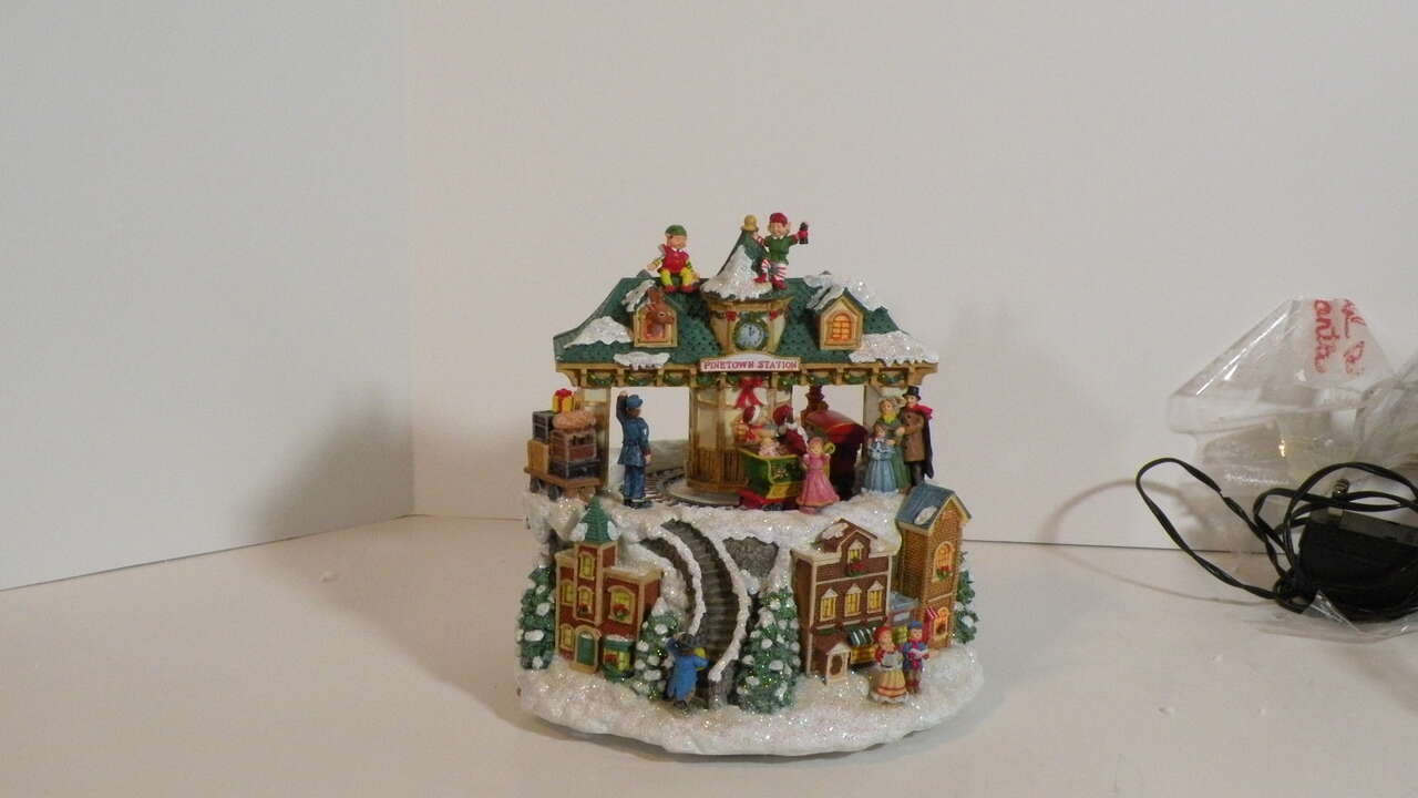 San Francisco Music Box Company Pinetown Station Music and Lights and rotating train as 8 Christmas tunes play. This is a fun piece and an exciting musical scene for little ones as they watch the train revolve around the town and the Christmas tunes play. The music box still works but is a little rough sounding and the town lights up. There is an on off switch on bottom and it runs on a C battery. Will brighten up the holidays and help keep your kids occupied. It'sin great condition. is has one little girl that has arms missing but she faces the train, so you don't notice it. She has been reglued to her position. All other figures are there. The scene is covered in glistening snow and the elves are sitting on the roof.