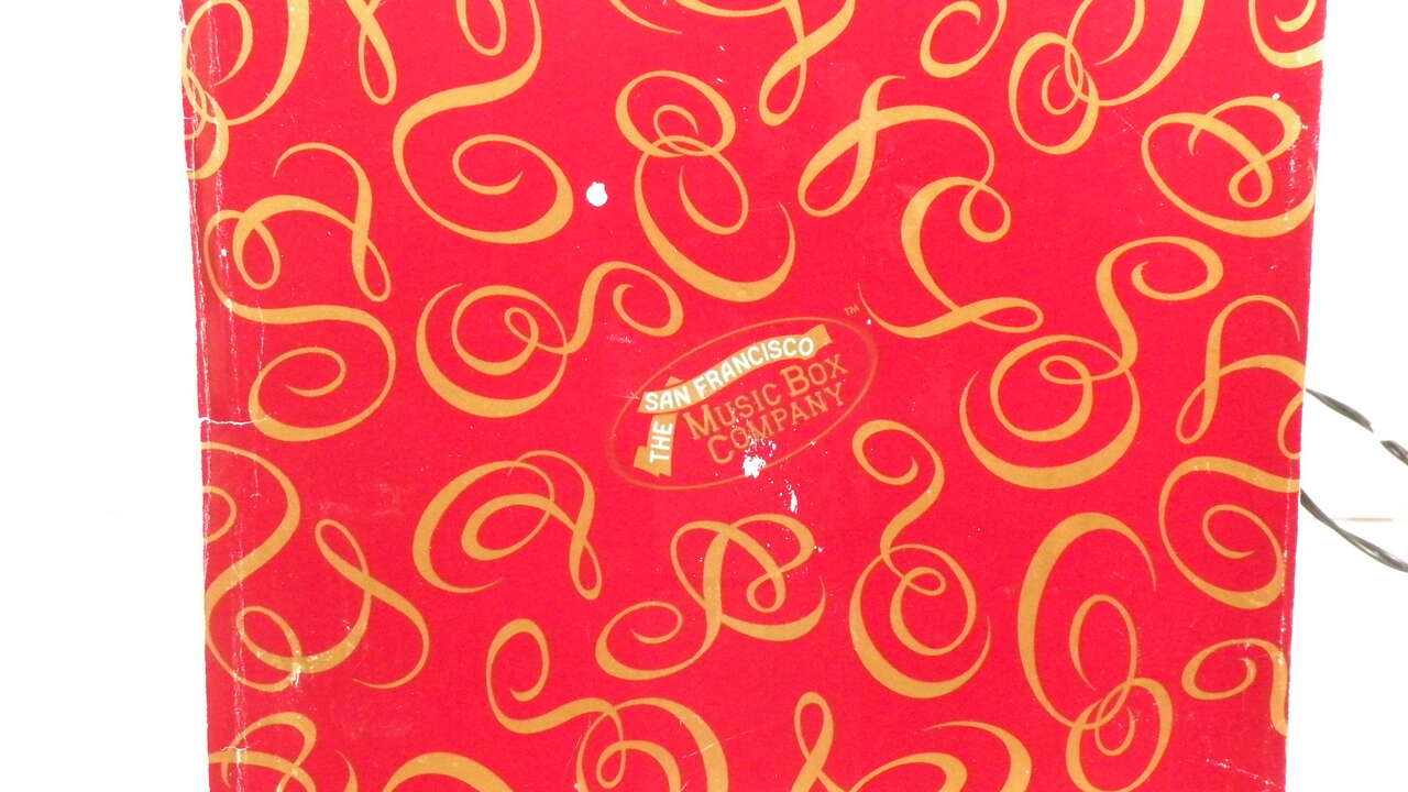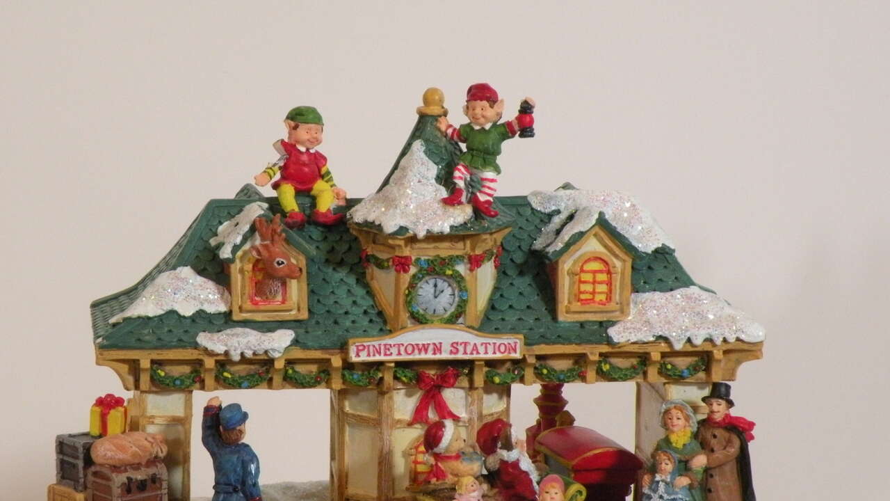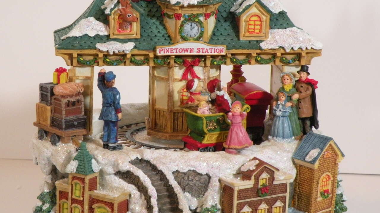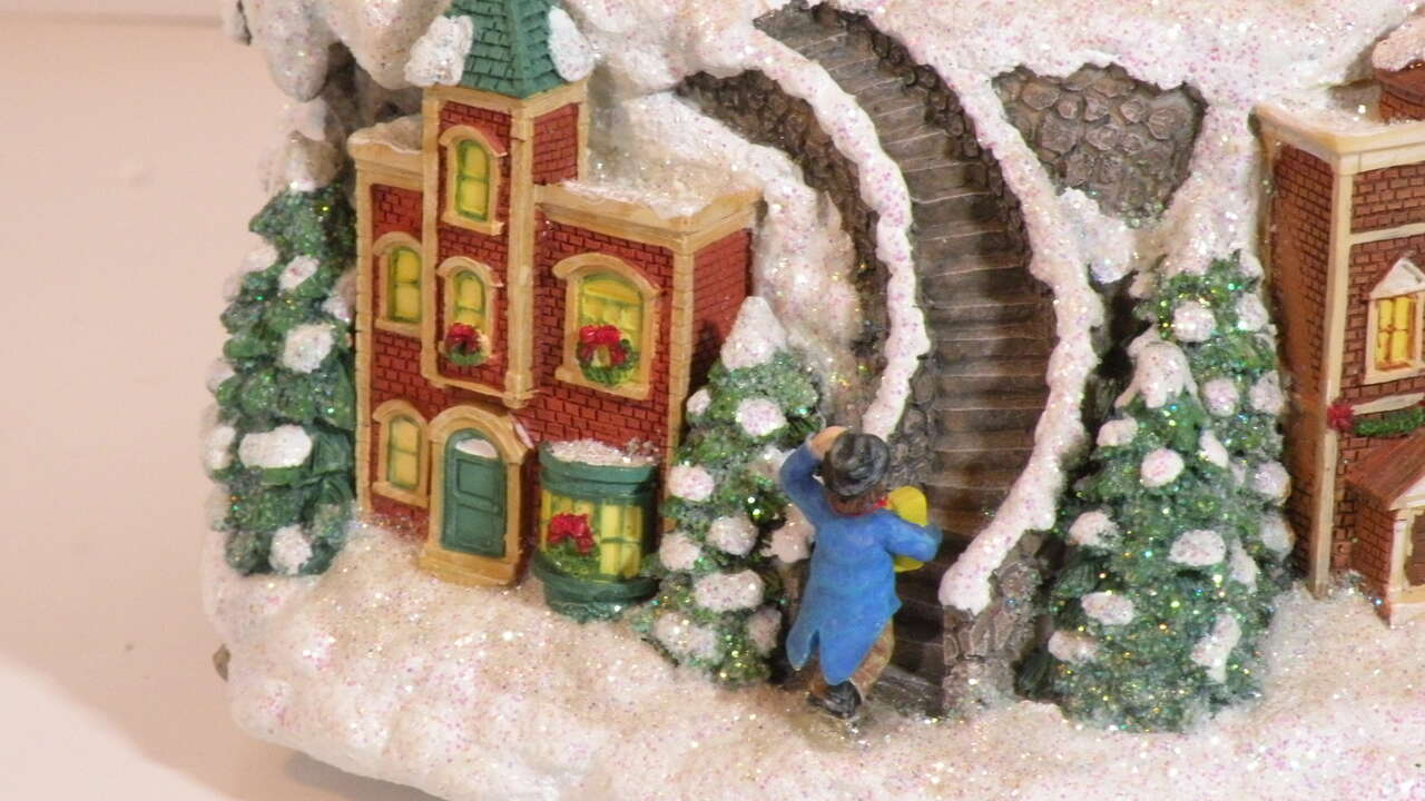 San Francisco Music Box Company Pinetown Station Music and Lights and rotating train as 8 Christmas tunes play. This is a fun piece and an exciting musical scene for little ones as they watch the train revolve around the town and the Christmas tunes play. The music box still works but is a little rough sounding and the town lights up. There is an on off switch on bottom and it runs on a C battery. Will brighten up the holidays and help keep your kids occupied. It'sin great condition. is has one little girl that has arms missing but she faces the train, so you don't notice it. She has been reglued to her position. All other figures are there. The scene is covered in glistening snow and the elves are sitting on the roof.