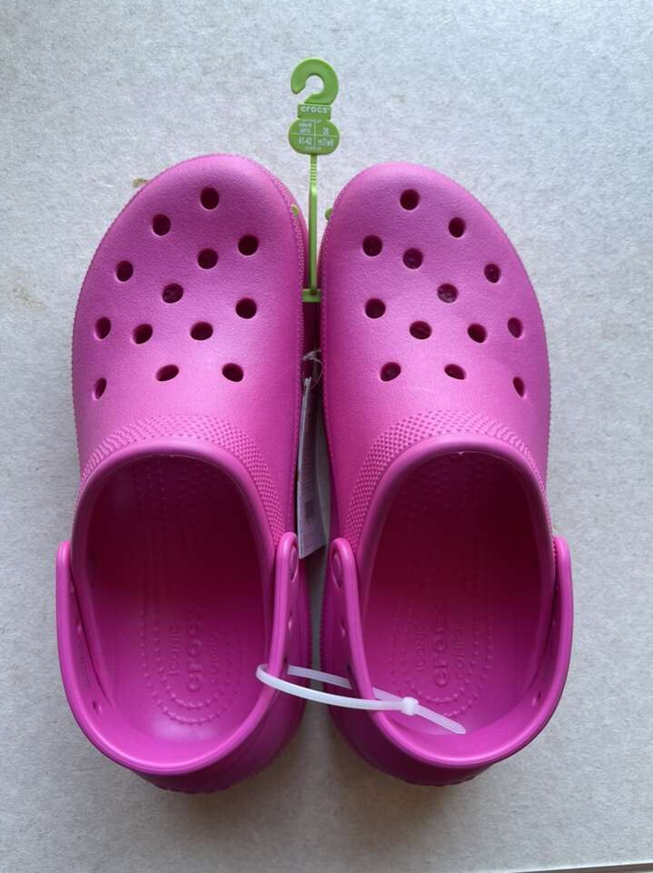 VenmoNew with tags! Size 9 or 10 women’s. The Classic Clog has been reimagined with an extra dose of height, attitude, and style that features an ultra-contoured outsole that supports the upper you know and love - but there's more. The new customizable backstrap also holds Jibbitz™M charms, so you can personalize your look even more. Women's Crocs Classic Clog Details: • Unique 2-inch height, measured from floor to hee rest • Textured details around the heel, toe box and collar • Customizable with Jibbitz™M charms • Iconic Crocs Comfort™M. Lightweight. Flexible. 360-degree comfort.