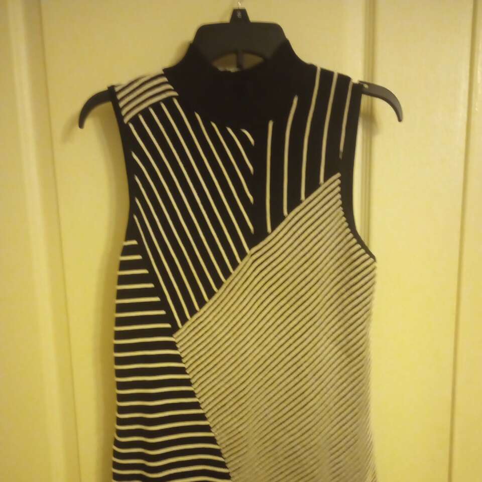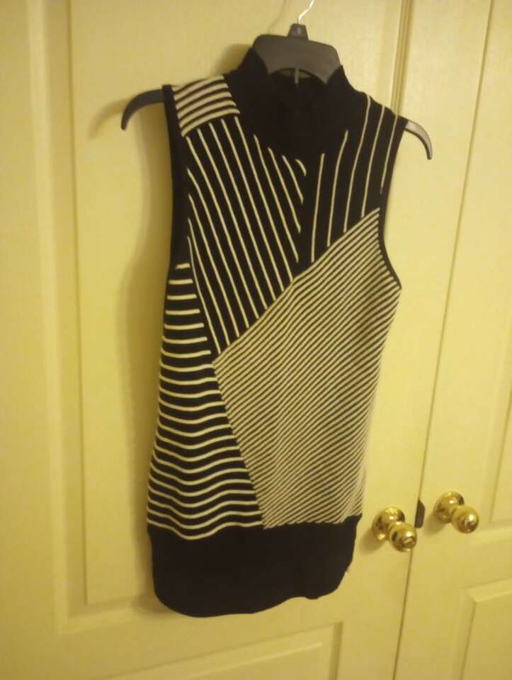 Like-New ladies black and white sleeveless top with a turtleneck, size small. Dana Buchman brand. Faux-blouse underneath the sweater like top. In excellent condition and from a pet and smoke-free home. 60% cotton, 40% rayon. $10 cash or Venmo. Will hold with Venmo. Text if interested. Feel free to take a look at my other ads-lots for sale including a bunch of women's clothing.