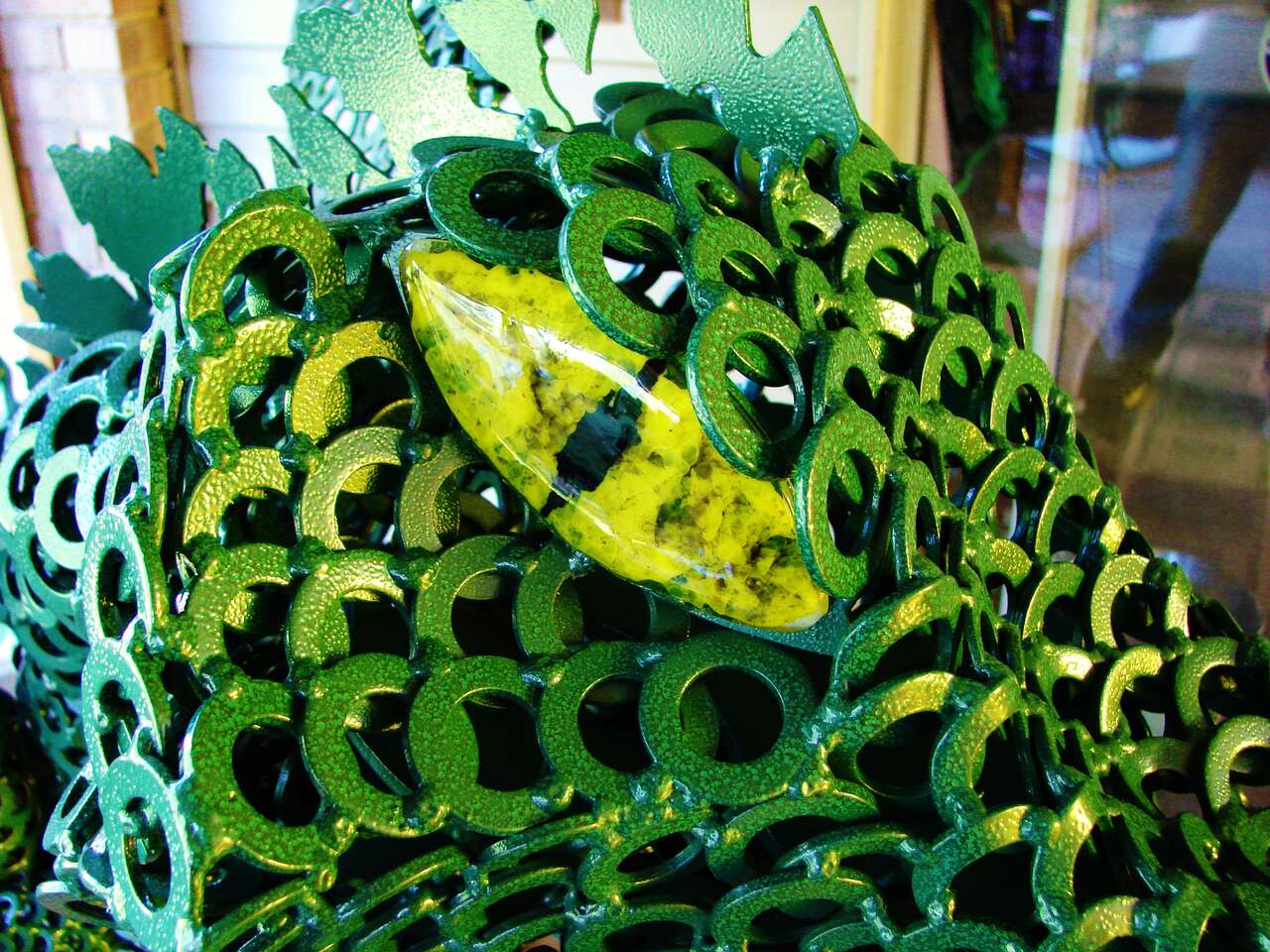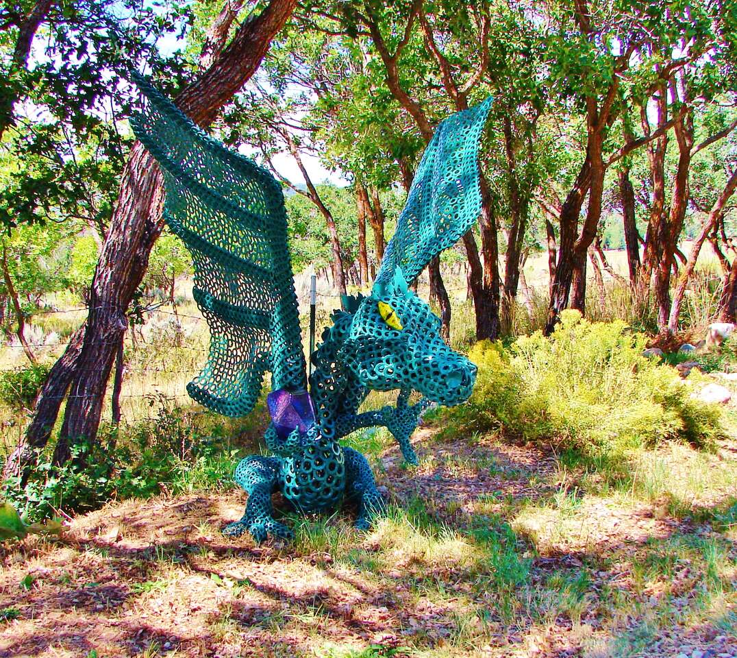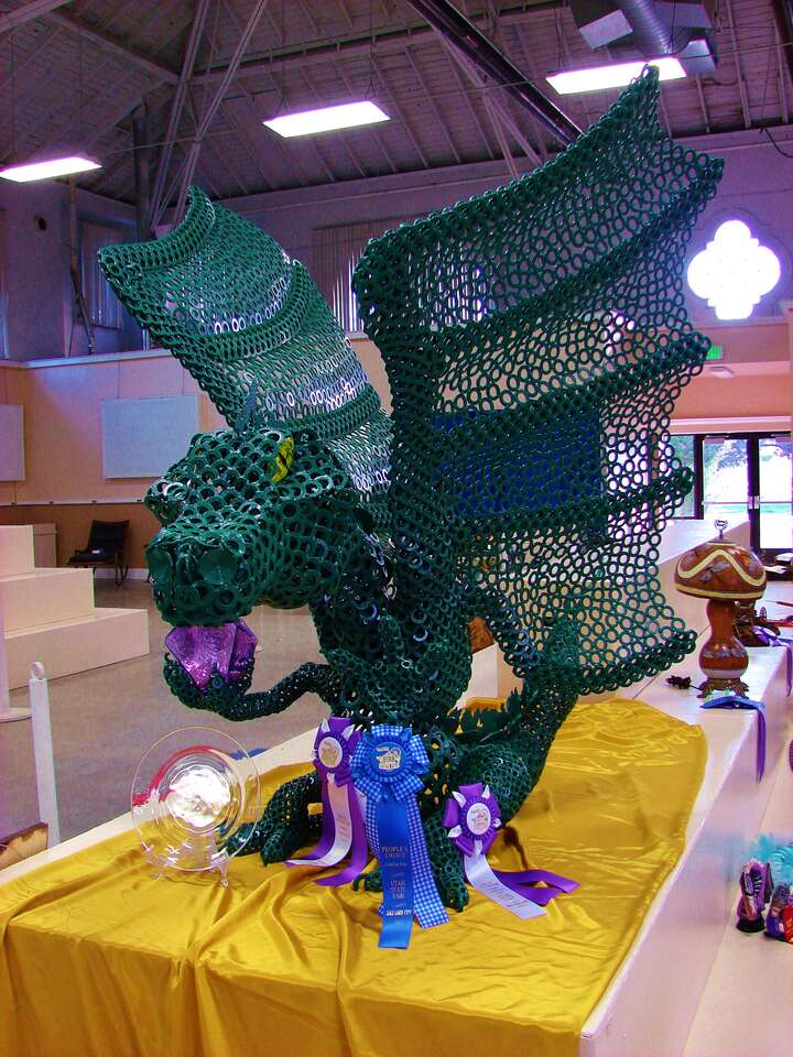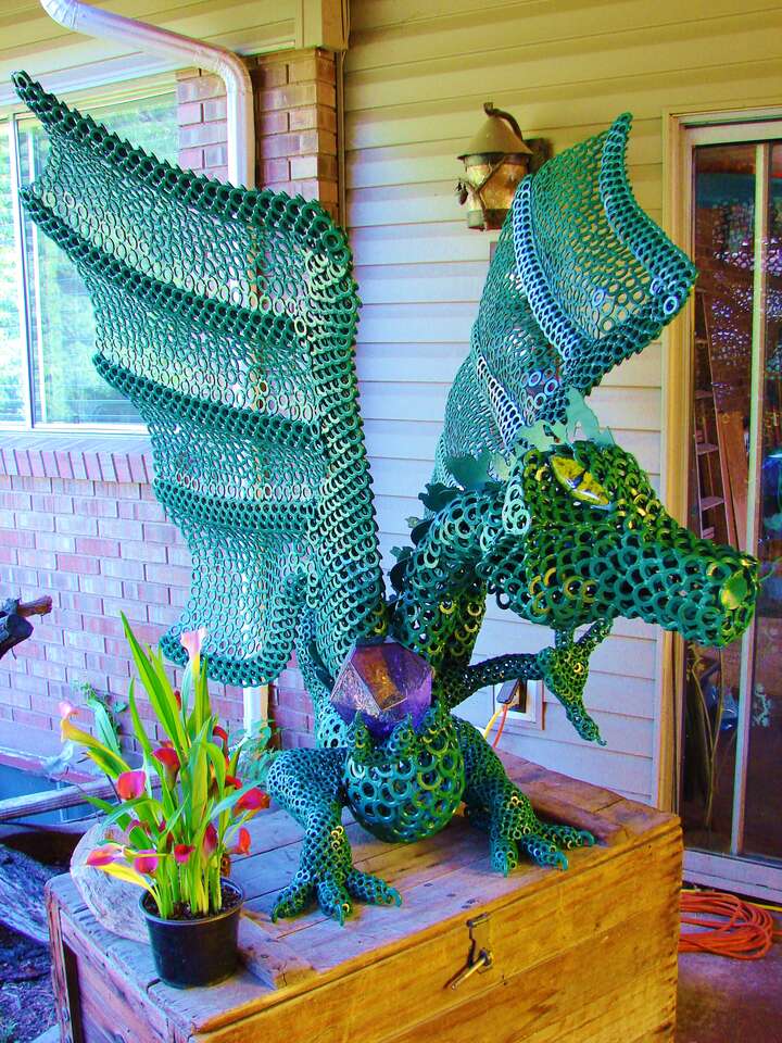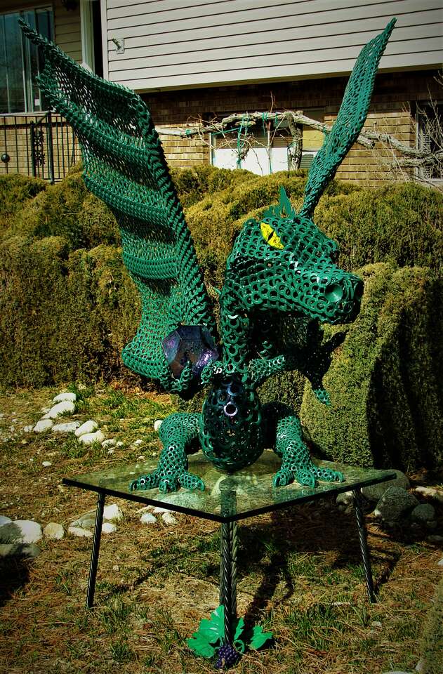 10,600 flat washers were used to create this fantasy creature, starting at the tail, each washer was welded one by one. There was no plan when I started this piece, with 1500 hours, I was glad to finish it. This Dragon took first place in two metal divisions, and "Best of Show" at the Utah State Fair. It is 57" high, 48" wide, and 62" long. The wings are removeable for travel. The eyes are custom glass.