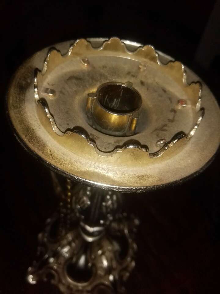 Antique silver plated candle holder with chain attached flame snuffer. Asking price OBO.