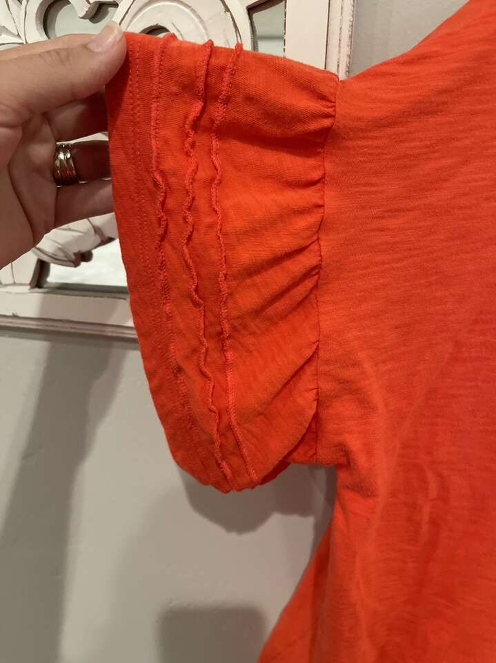 VenmoThis has a darling, ruffle sleeve detail. It still hits right above the elbow. This is in excellent condition. No holes or stains. Pet free, smoke free, clean home. To see all my other women’s listings click on the tab that says more from the seller or text me for pictures.