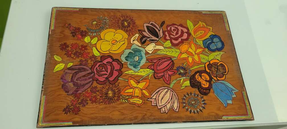 This is very bright hippie art deco on wood I will ship for free with payment by venmo 21x13.58 measurements