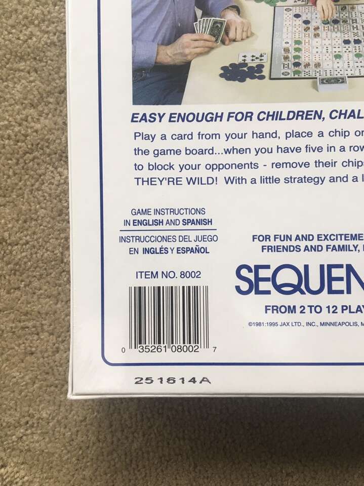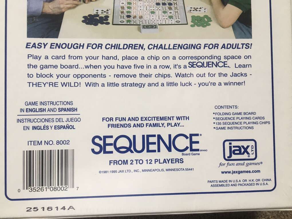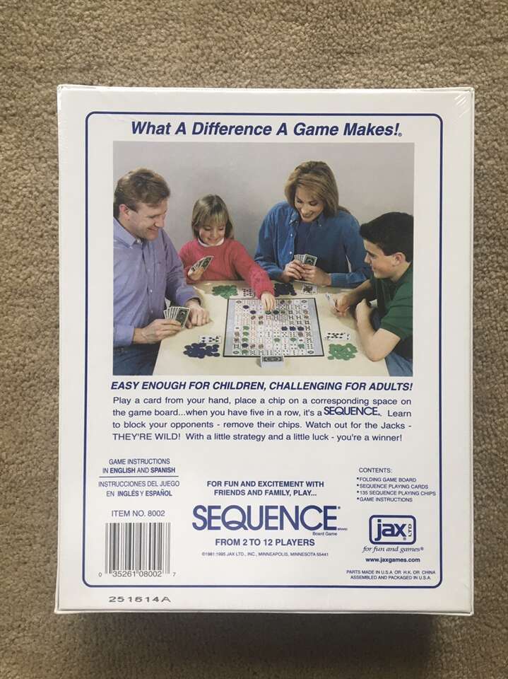 NEW (sealed in plastic) Vintage 1995 original Sequence Board Game: An Exciting Game of Strategy. It’s fun, it’s challenging, it’s exciting, it’s Sequence. 2-12 players, ages 7+. By Jax Games. New, unopened condition. Text only. Cash or Venmo. Discount on multiple items.