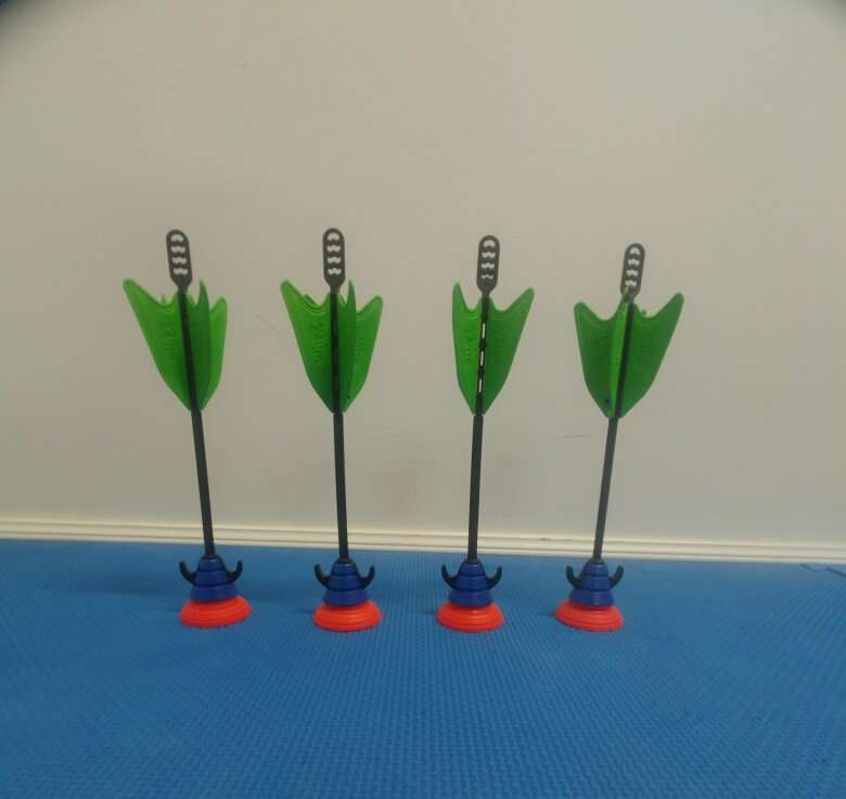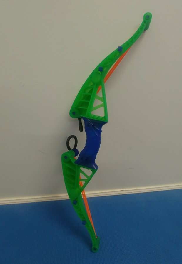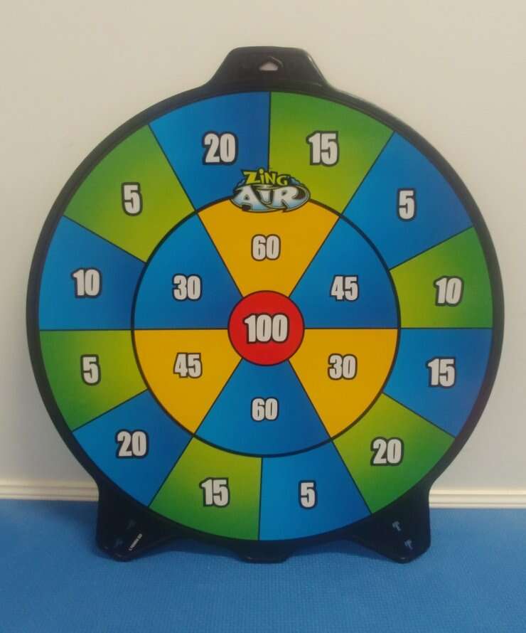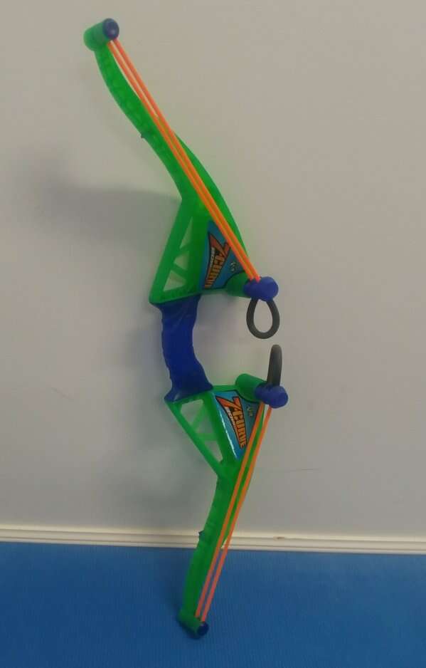 Zing Air toy bow with 4 arrows and a double sided target. The bow has hooks on the back for arrows. Arrows suction tips may come off but can easily be fixed with glue. Great for kids. ng