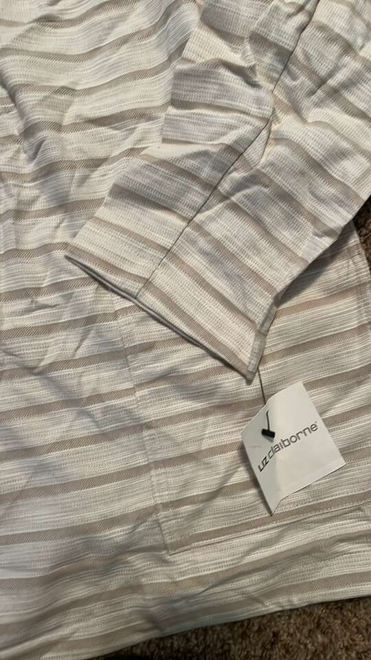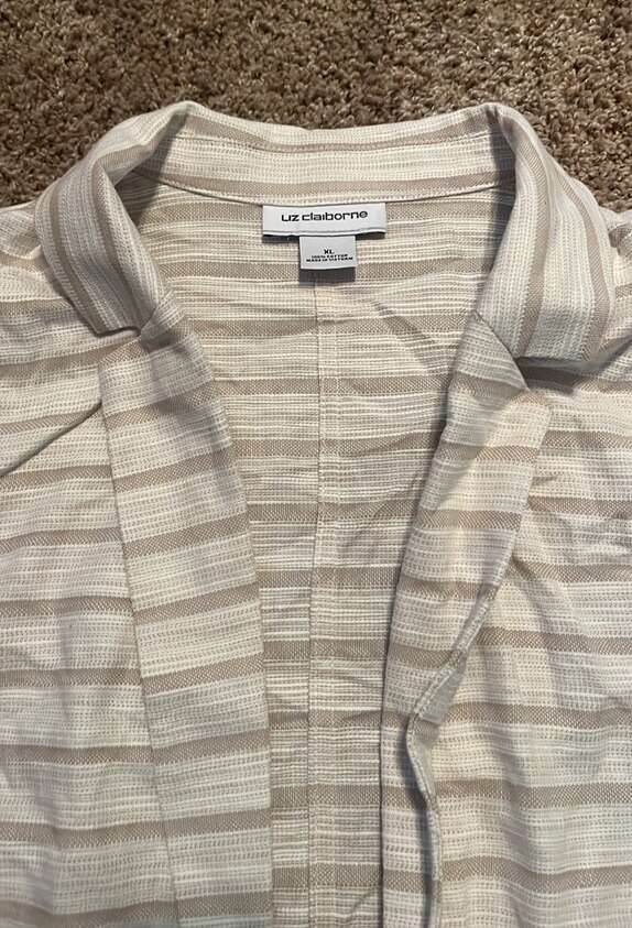 Brand new with tags Open front collared blazer Liz Claiborne Sand brown and cream. 100% cotton Stripes Front pockets at waist Machine wash cold Can be dressed up or down depending on how you want to wear it. Smoke and pet free home $20 Located in American fork Cash/Venmo