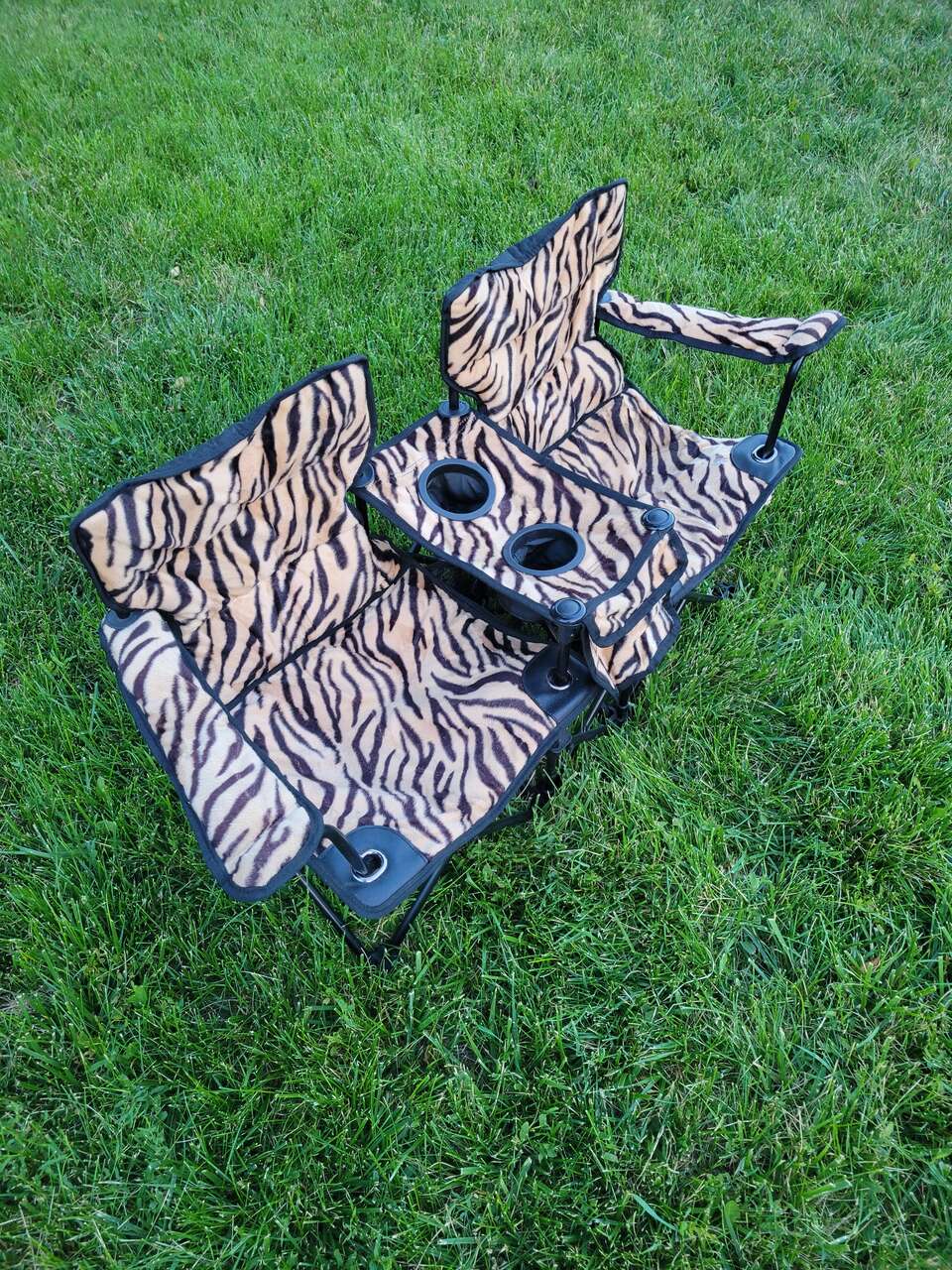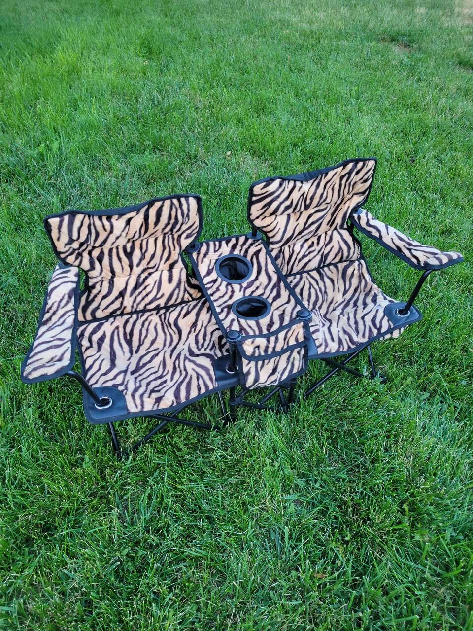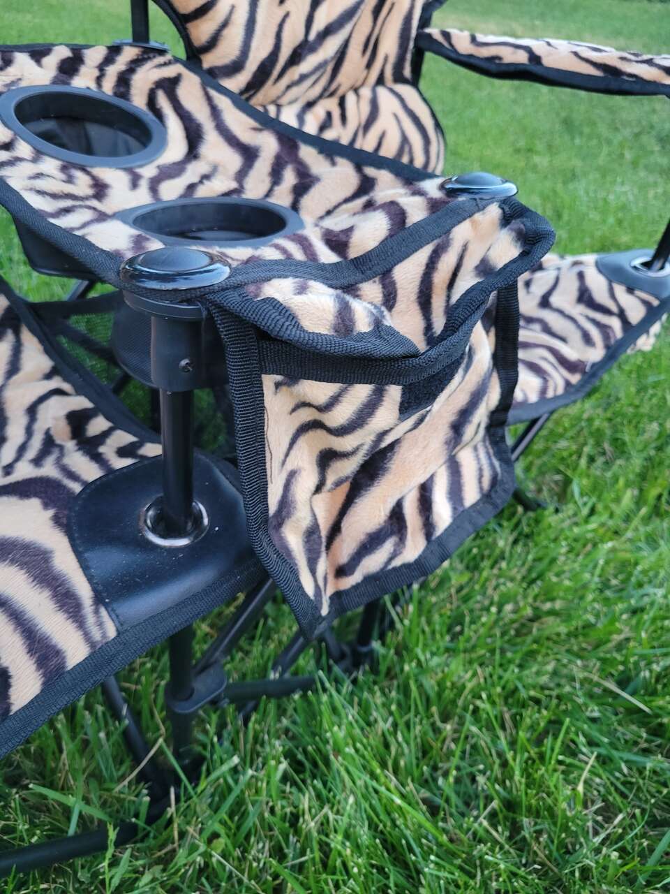 Has 2 cup holders, and storage in-between the two seats, with a velcro pouch in front