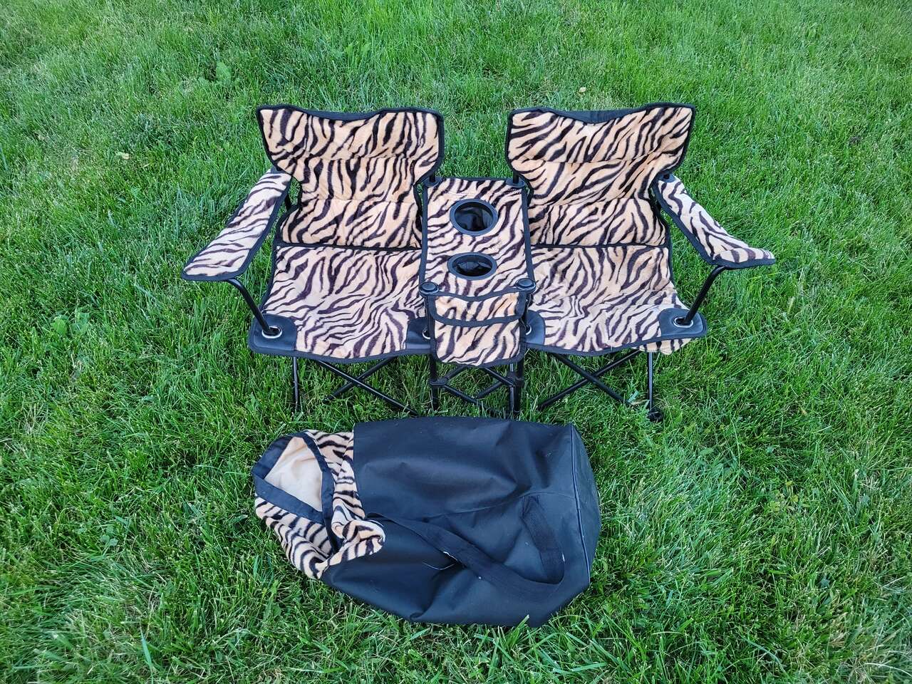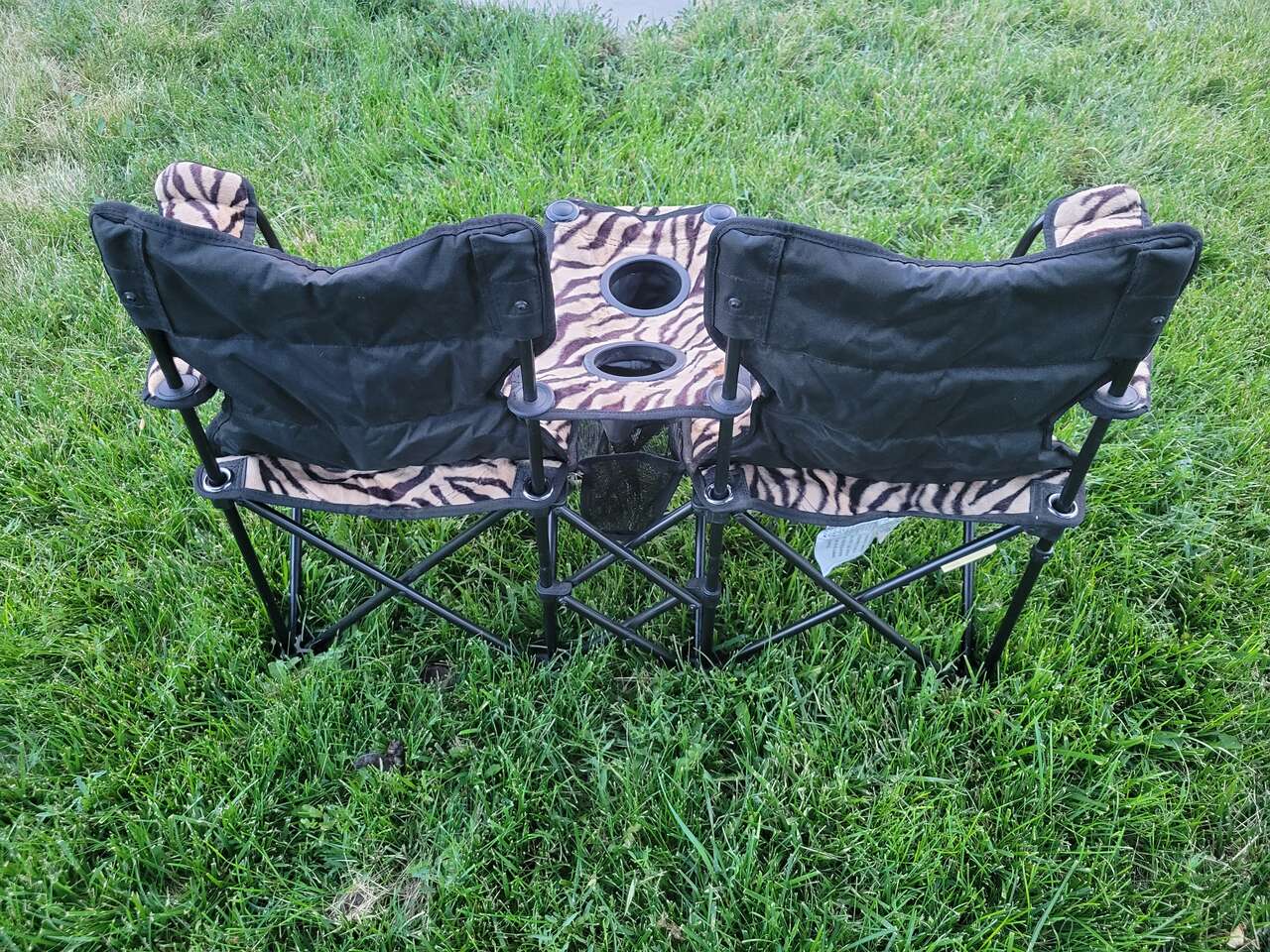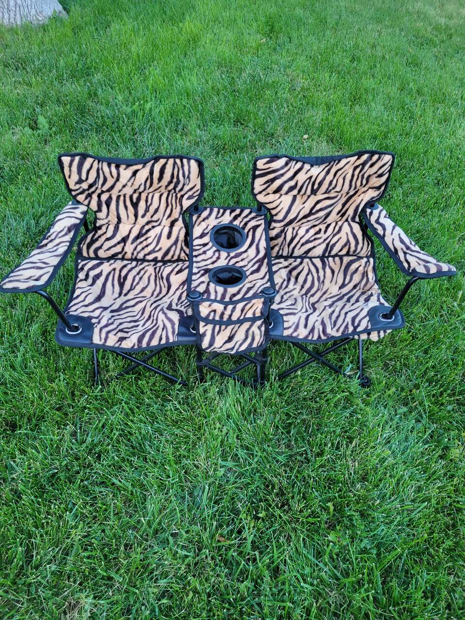 Has 2 cup holders, and storage in-between the two seats, with a velcro pouch in front