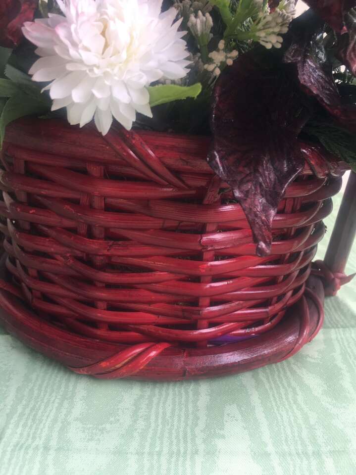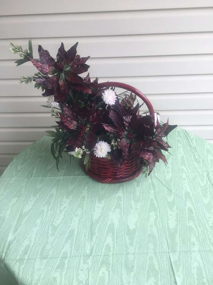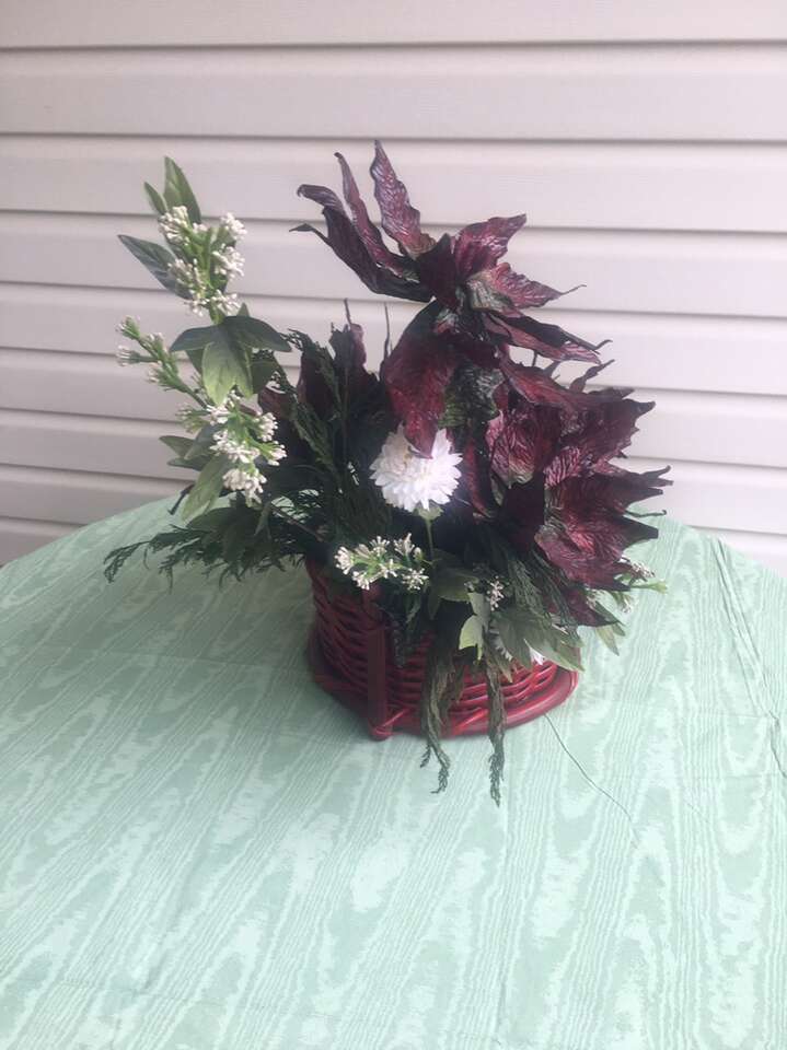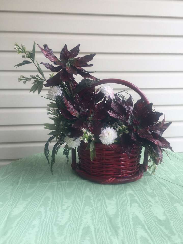 Wine Colored Sturdy Basket with Christmas Arrangement. From the top of the basket to the Handle is 5 inches. The Arrangement from the table to the top of the Arrangement is 21 inches.