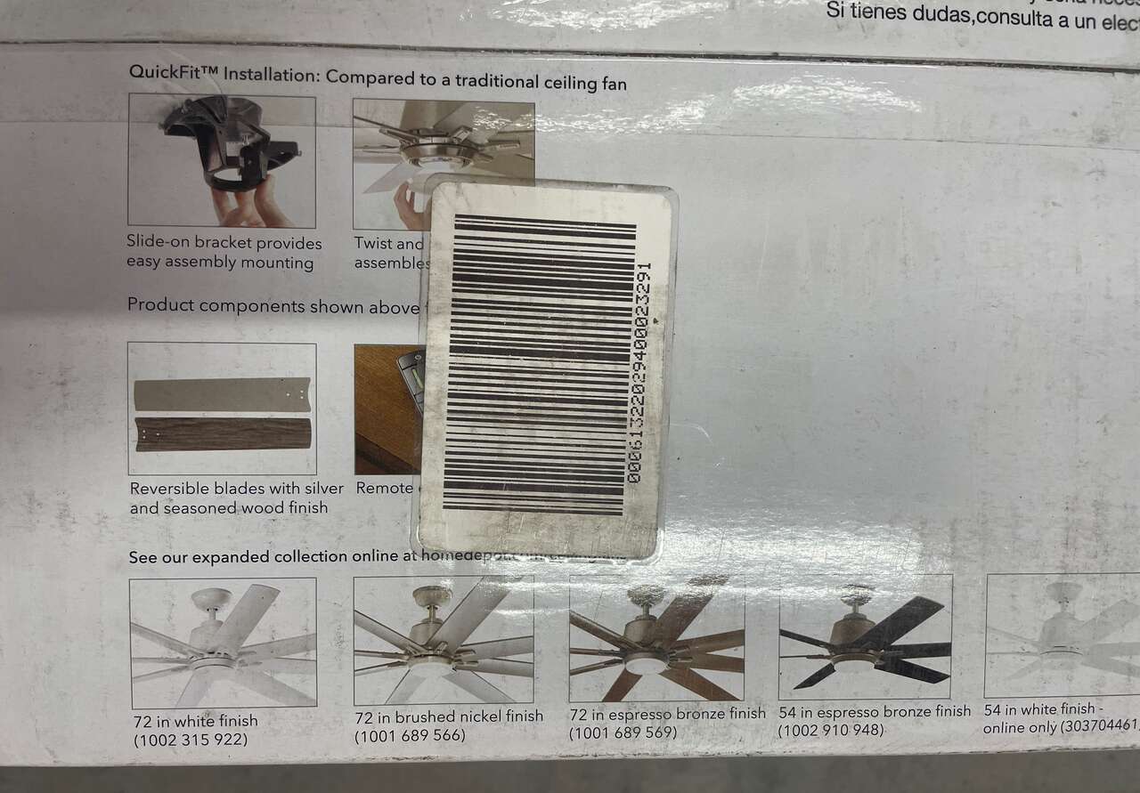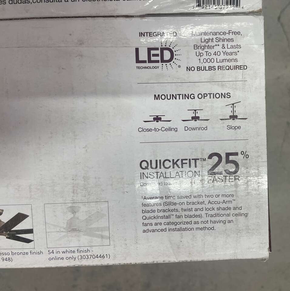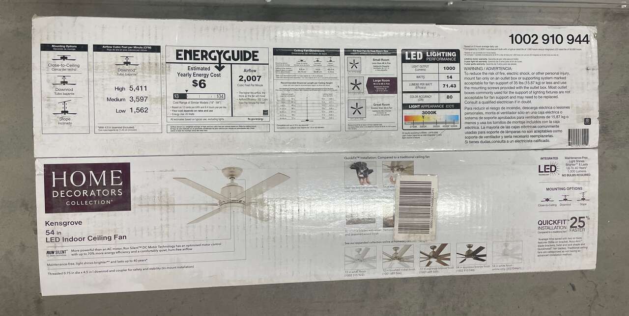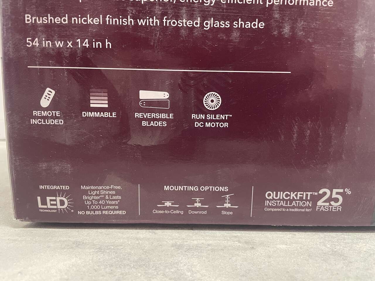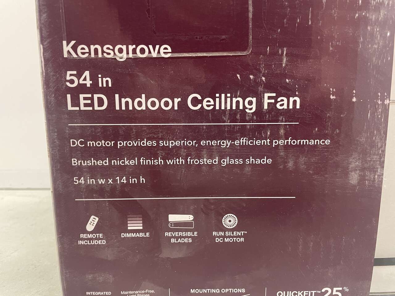 Up for grabs is a NEW Home Decorators Kensgrove 54 in. Integrated LED Brushed Nickel Ceiling Fan with Light and Remote Control.