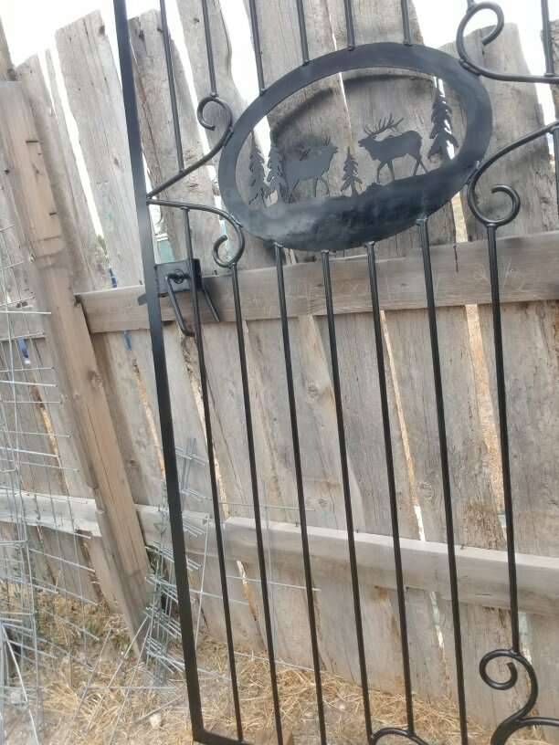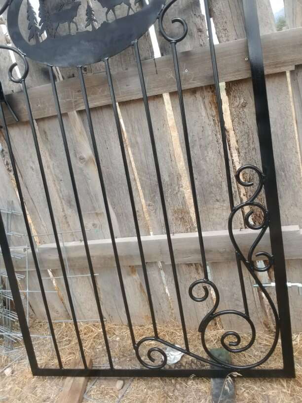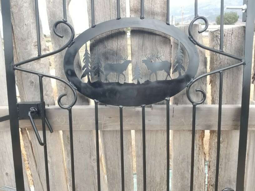 Beautiful ornamental steel backyard gate with 2 elks and pine trees panorama, size of the gate it's 80" at its highest point × 42" wide plus 2" for hinge bolt; the bolt its adjustable up to 6", $510, plus tax FREE DELIVERY IN THE STATE OF UTAH cash or venmo Leo'swelding llc Leoswelding.services