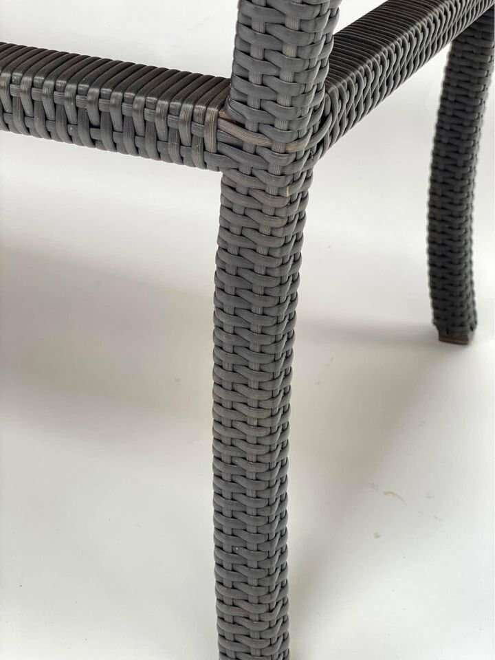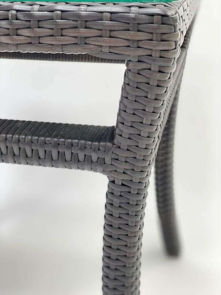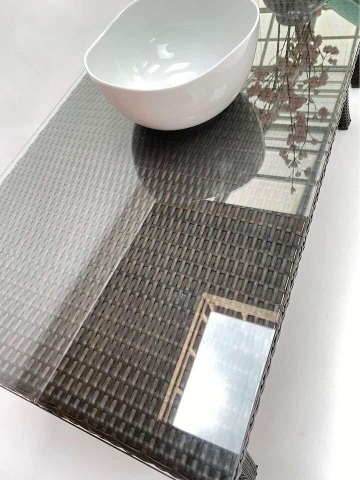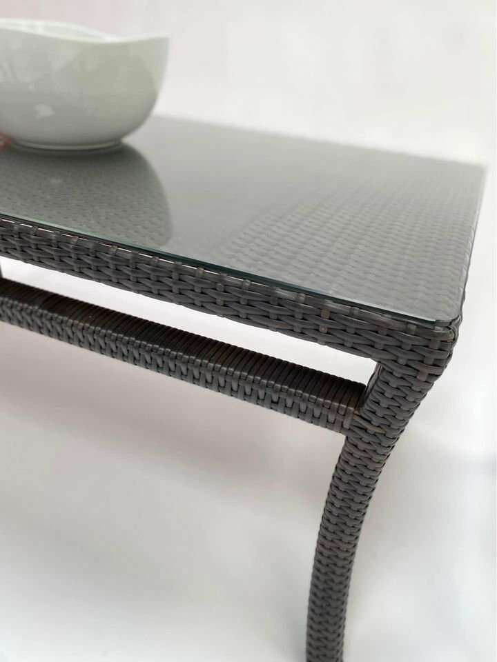 Beautiful wicker coffee table and end table Glass with perfect beautiful round edges included Perfect clean lines and lovely neat crisp and pretty look Perfect condition No chips in glass Would be beautiful indoors or outdoors by the pool or outdoor fire pit.