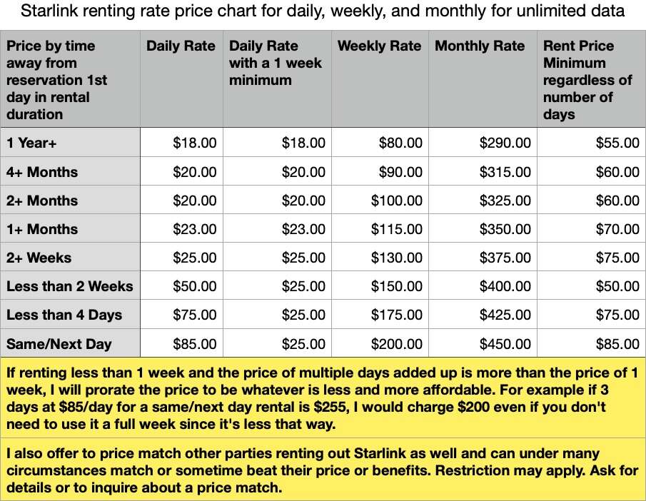 Rental includes Starlink satellite dish, router, cables, a tote for safe transportation and service.