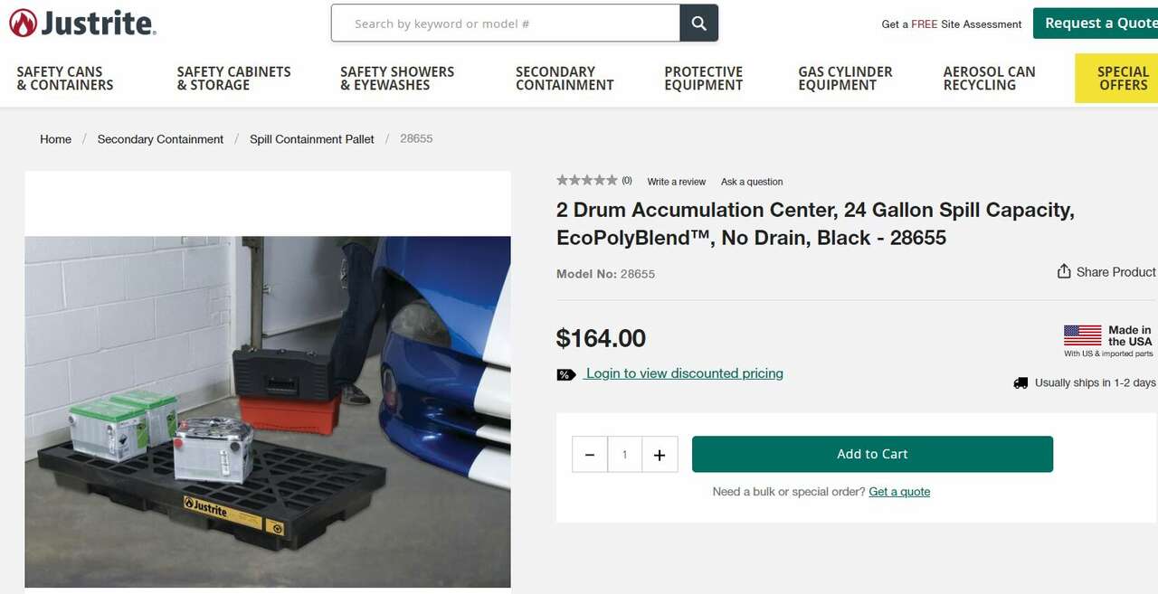 VenmoNew Justrite 2 Drum Rack with 24 gallon spill capacity Keep your workshop or garage clean and free of spills with this containment pallet It is 49" l x 25" w x 5.5" h and weighs around 30 lbs. Tough but light enough to move around. Cash or Venmo only