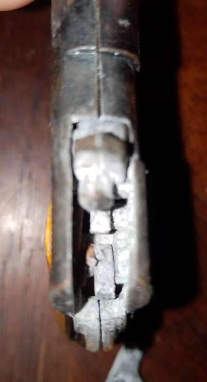 Old school miniature single shot cap gun. 2inch long 1 1/2inch depth, it's a keychain but normal wear wore off the keychain O ring. The hammer has broken off, won't fire unless fixed. Asking price OBO.