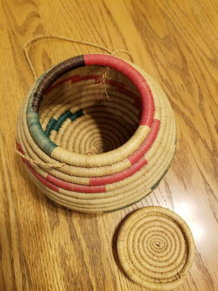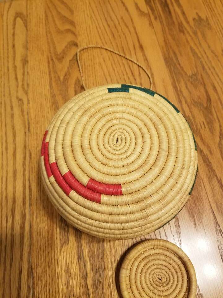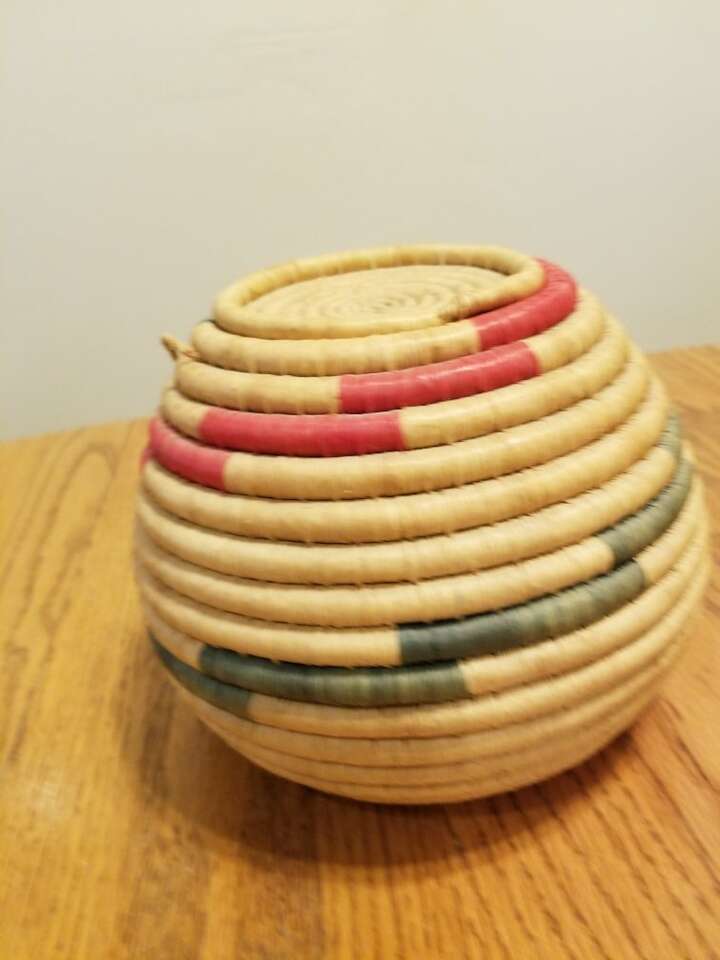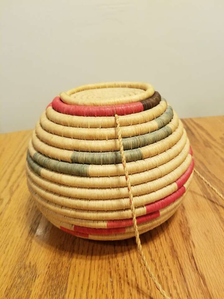 This basket is from West Africa and features bright pink/red and green color with natural color grass. It measures 7 inches tall and is 7 1/2 inches wide. It has a tight lid on the top, and natural fiber cord if you wanted to hang it. The cord is 28 inches long. In excellent condition, have only used for display.