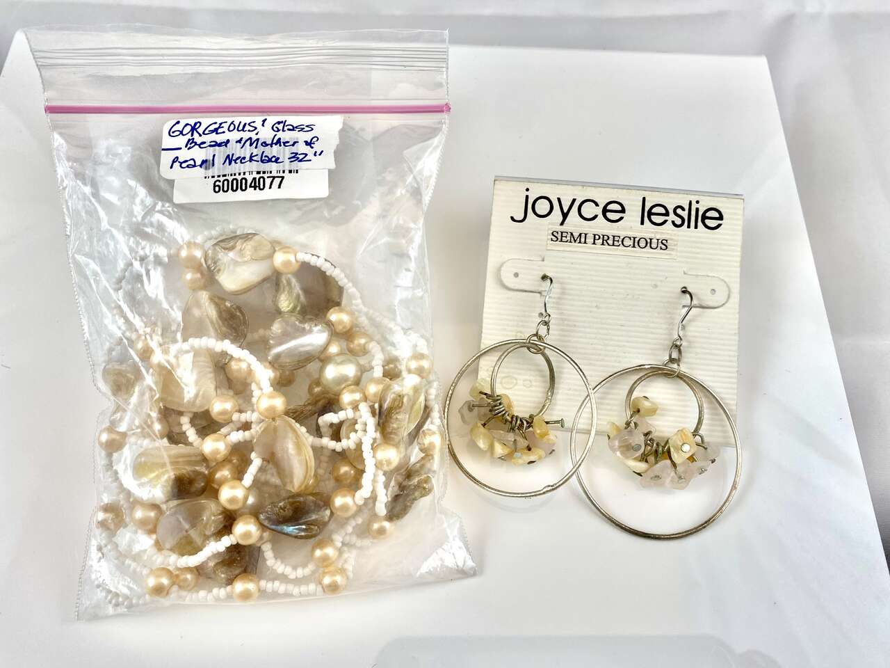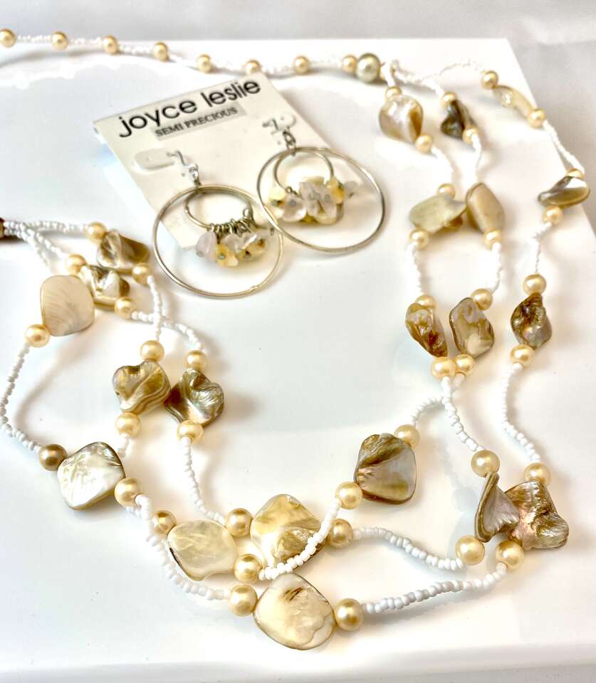NEW Beautiful Three Strand 32” Glass and Mother of Pearl Necklace + Free Earrings - See Photos.