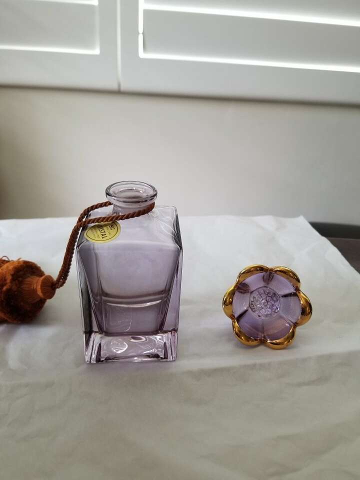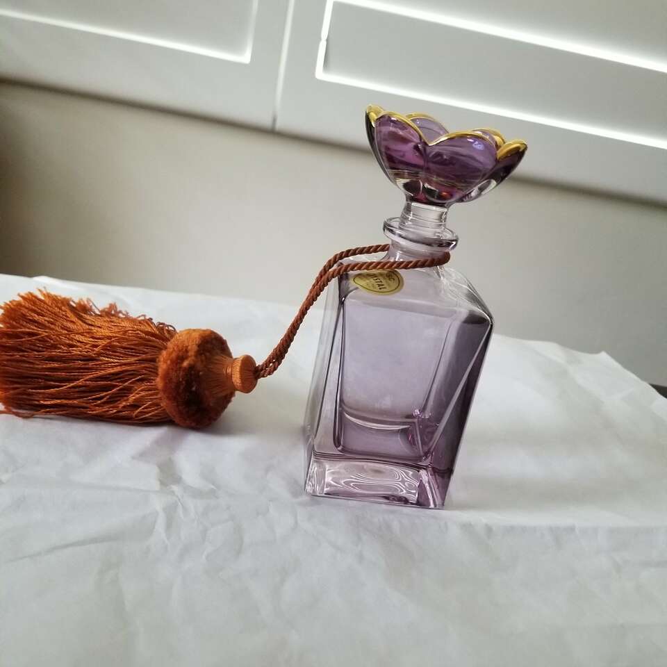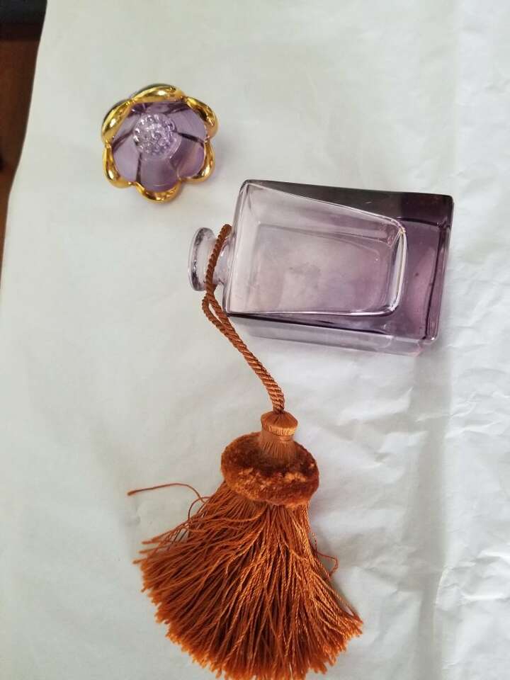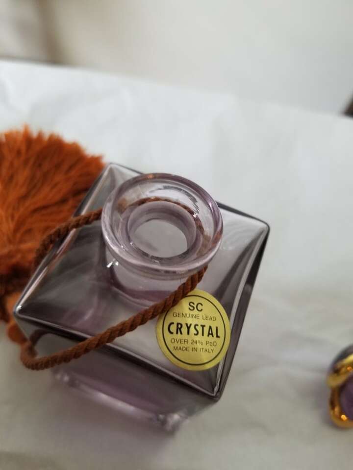 This lavender color perfume bottle is genuine lead crystal from Italy. It has never had perfume in it. The stopper features a lavender colored flower with gold trim. The bottle comes with a dark coral large tassel. It is 6 inches tall and two inches wide. In perfect condition. I have used for display only. Just reduced by $35. Reduced price again.