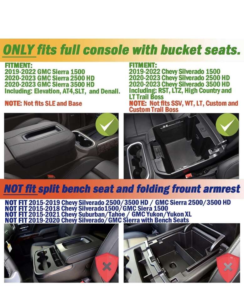 NOTE: Not fits SLE and Base NOTE: Not fits SSV, WT, LT, Custom and Custom Trail Boss TACOBRO Make Your Driving Life More Comfortable : Armrest Box of the Car is too Deep and Items in it are Placed in Disorder. So You Need TACOBRO Center Console Tray To Make Your Armrest Box More Orderly. Larger items can be stored below the organizer, while smaller items stored upper. Only fits full console with bucket seats. FITMENT: 2019-2022 GMC Sierra 1500 2020-2023 GMC Sierra 2500 HD 2020-2023 GMC Sierra 3500 HD Including: Elevation, AT4,SLT, and Denali. FITMENT: 2019-2022 Chevy Silverado 1500 2020-2023 Chevy Silverado 2500 HD 2020-2023 Chevy Silverado 3500 HD Including: RST, LTZ, High Country and LT Trail Boss