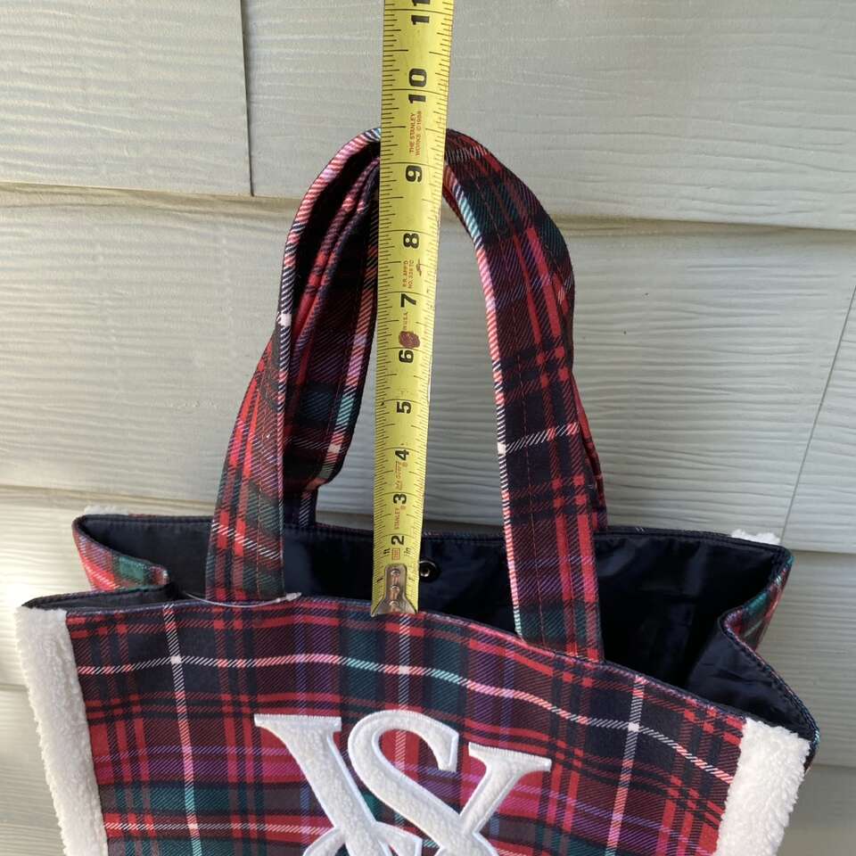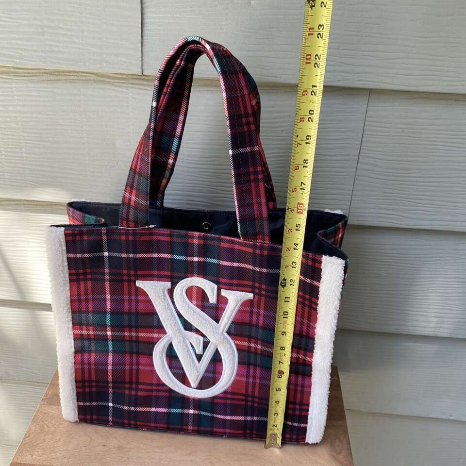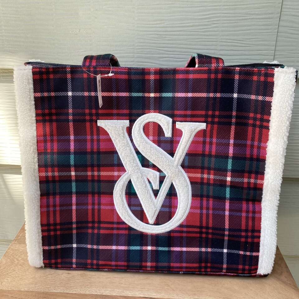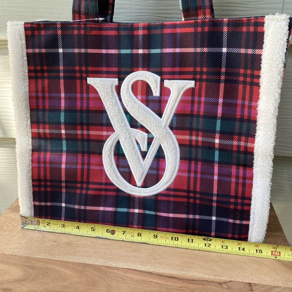 New Victoria Secret Tote Bag Cozy Sherpa trim plaid flannel material New with tags Snap closure See pictures for approximate measurements